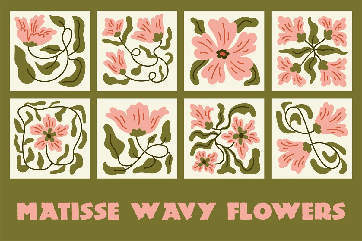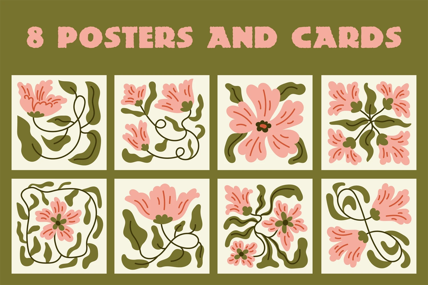 Trendy retro square posters and cards collection with abstract pink groovy flowers. Decorative wavy flowering plants with leaves and blossoms. Matisse inspires contemporary minimal arts. Modern liquid botanical set. Vintage aesthetic floral composition with nature elements. Vector illustration.