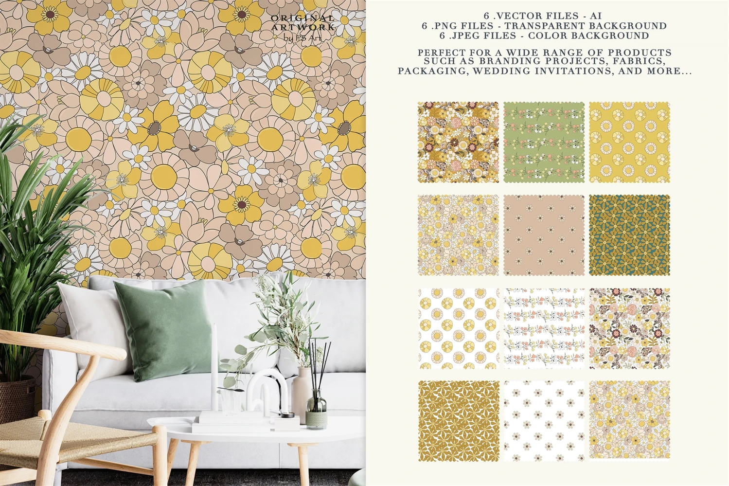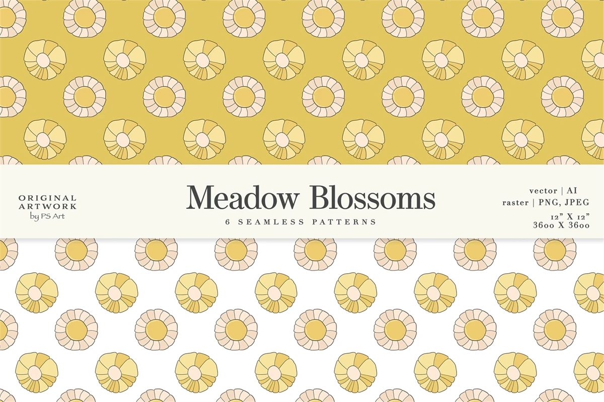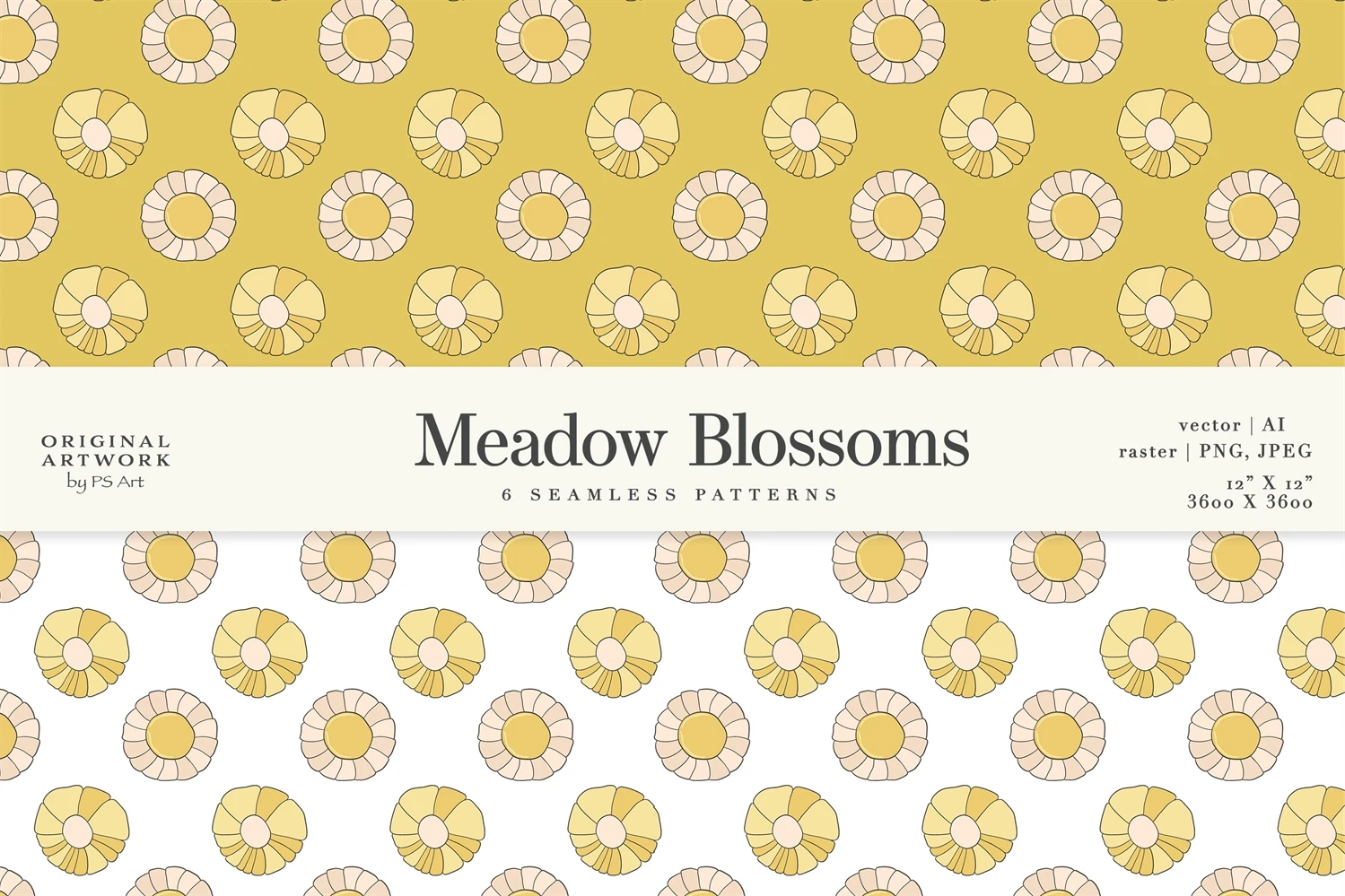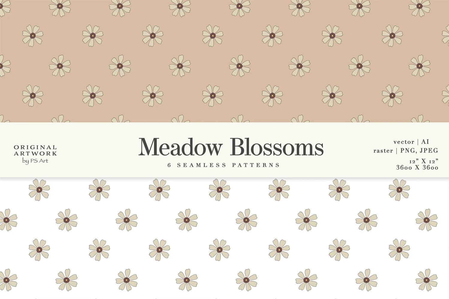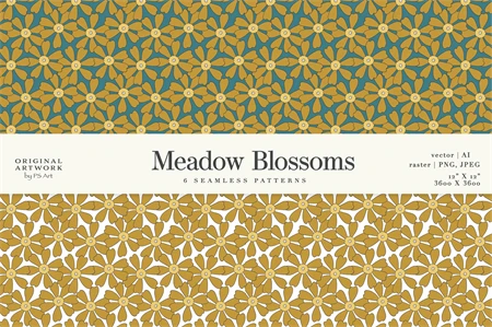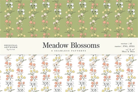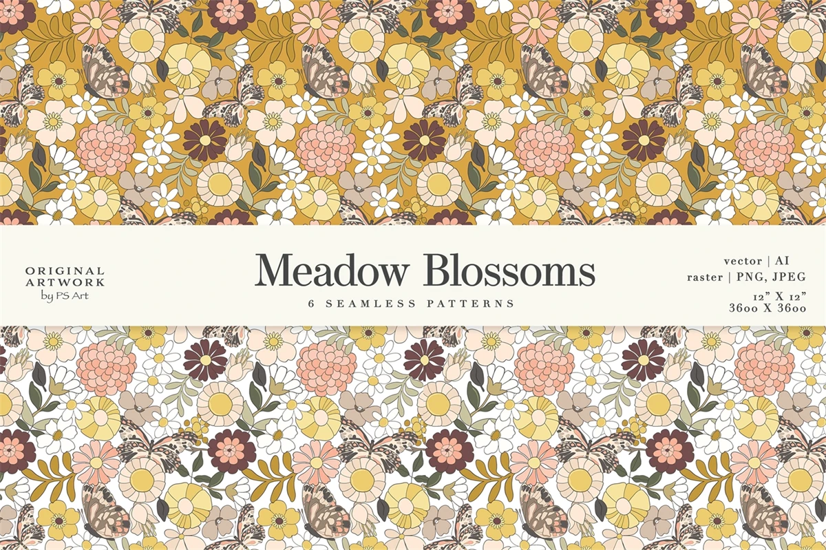 Introducing Meadow Blossoms, floral seamless pattern set featuring stylized flowers, leaves, and other natural elements in a retro style, in muted, pastel color palette. The overall effect is a charming and nostalgic design that evokes a sense of nostalgia and femininity.