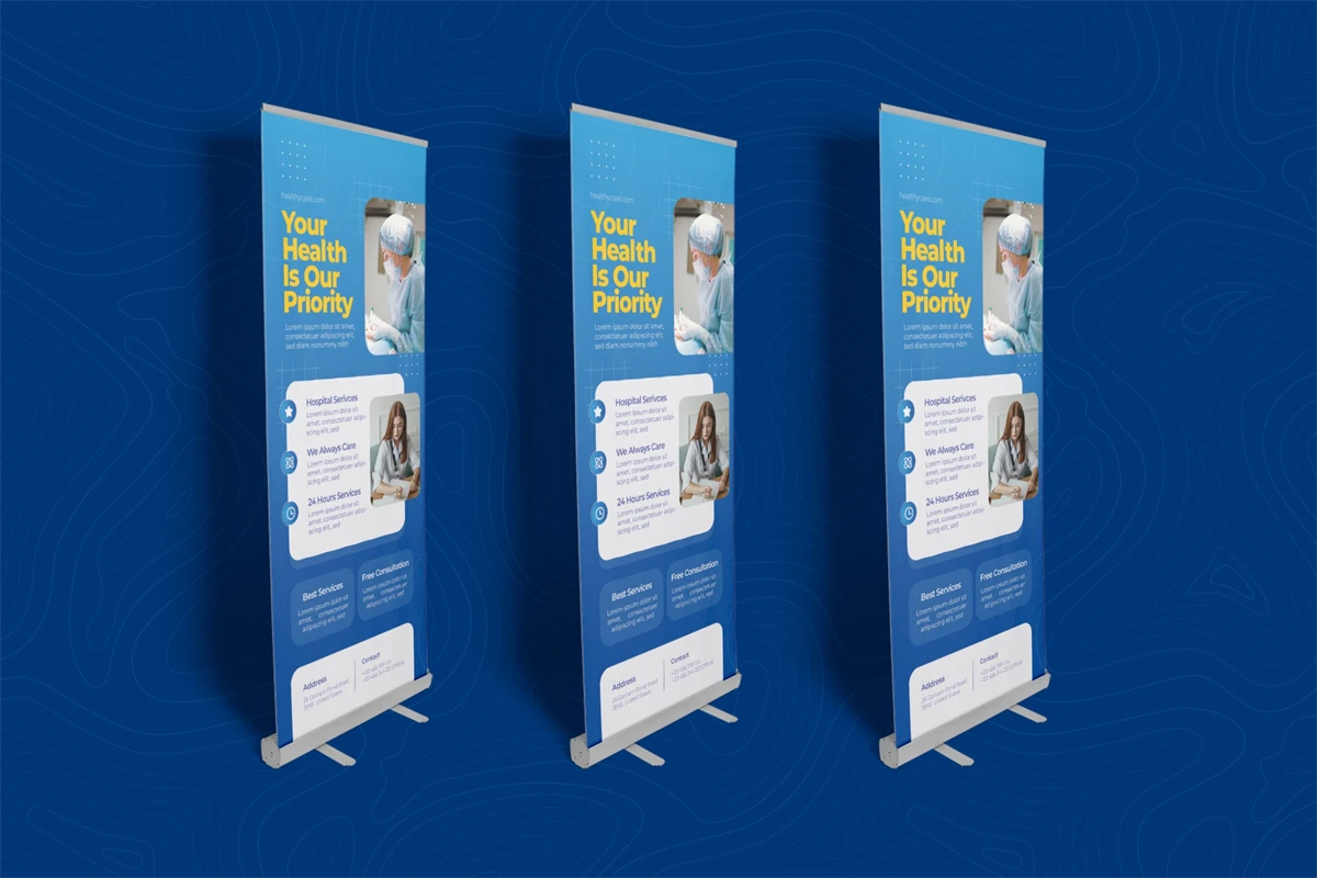 The versatile roll up banner template is very easy to use, modify and customize. Use this roll up banner and make the most of your campaign!