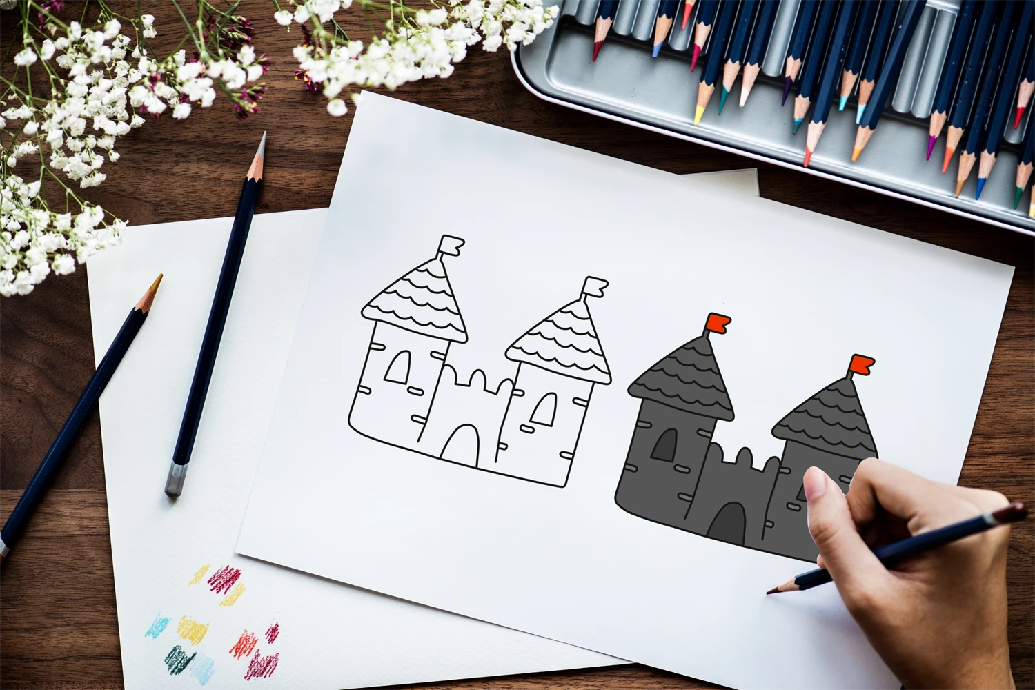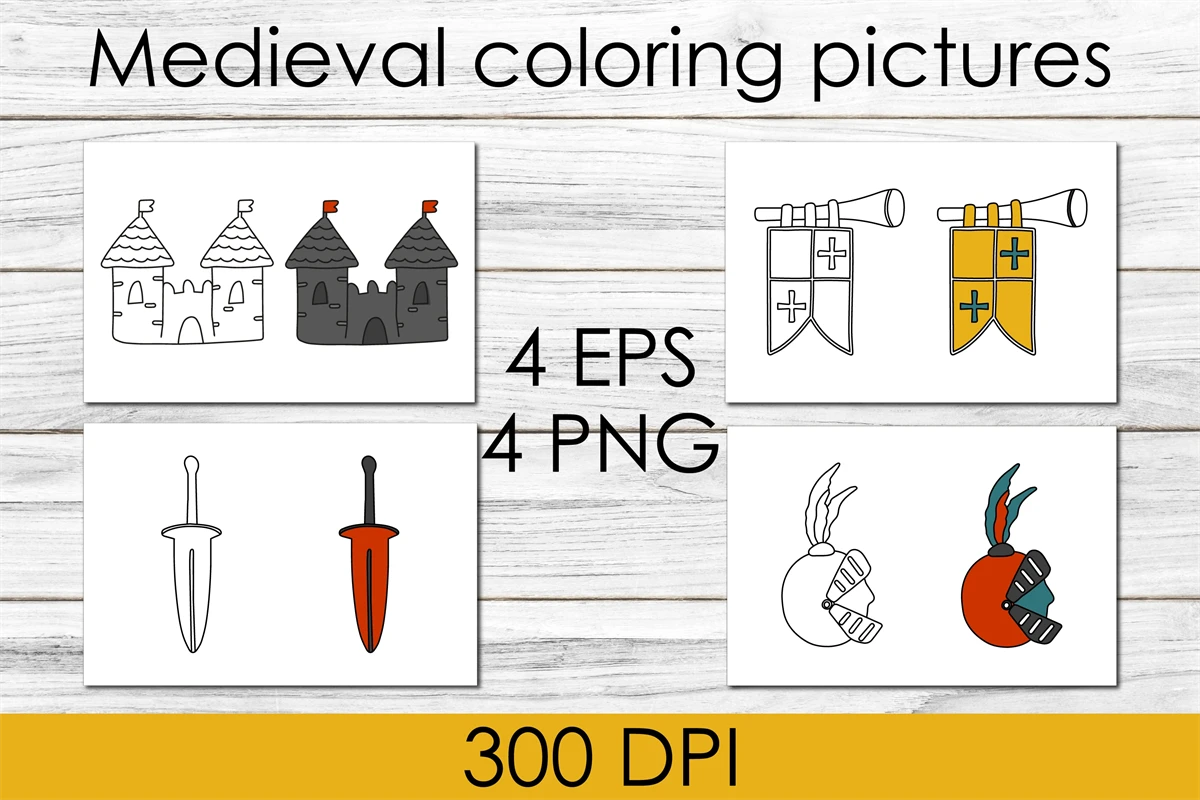 4 coloring pages for the youngest medieval theme. Cartoon pictures of castle, horn, sword, helmet.