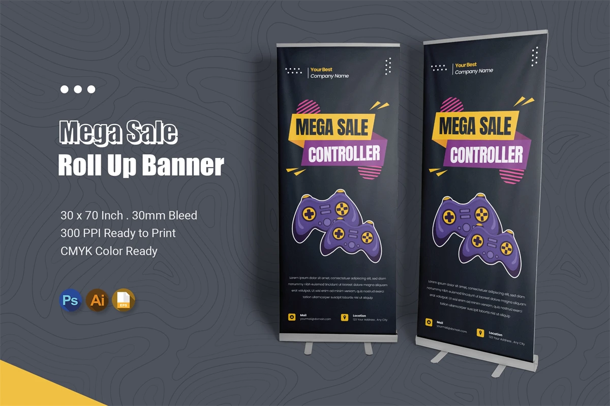 Our roll-up banner template tells your brand's story at a glance. This design stands out and can be used to showcase pictures and content effectively.