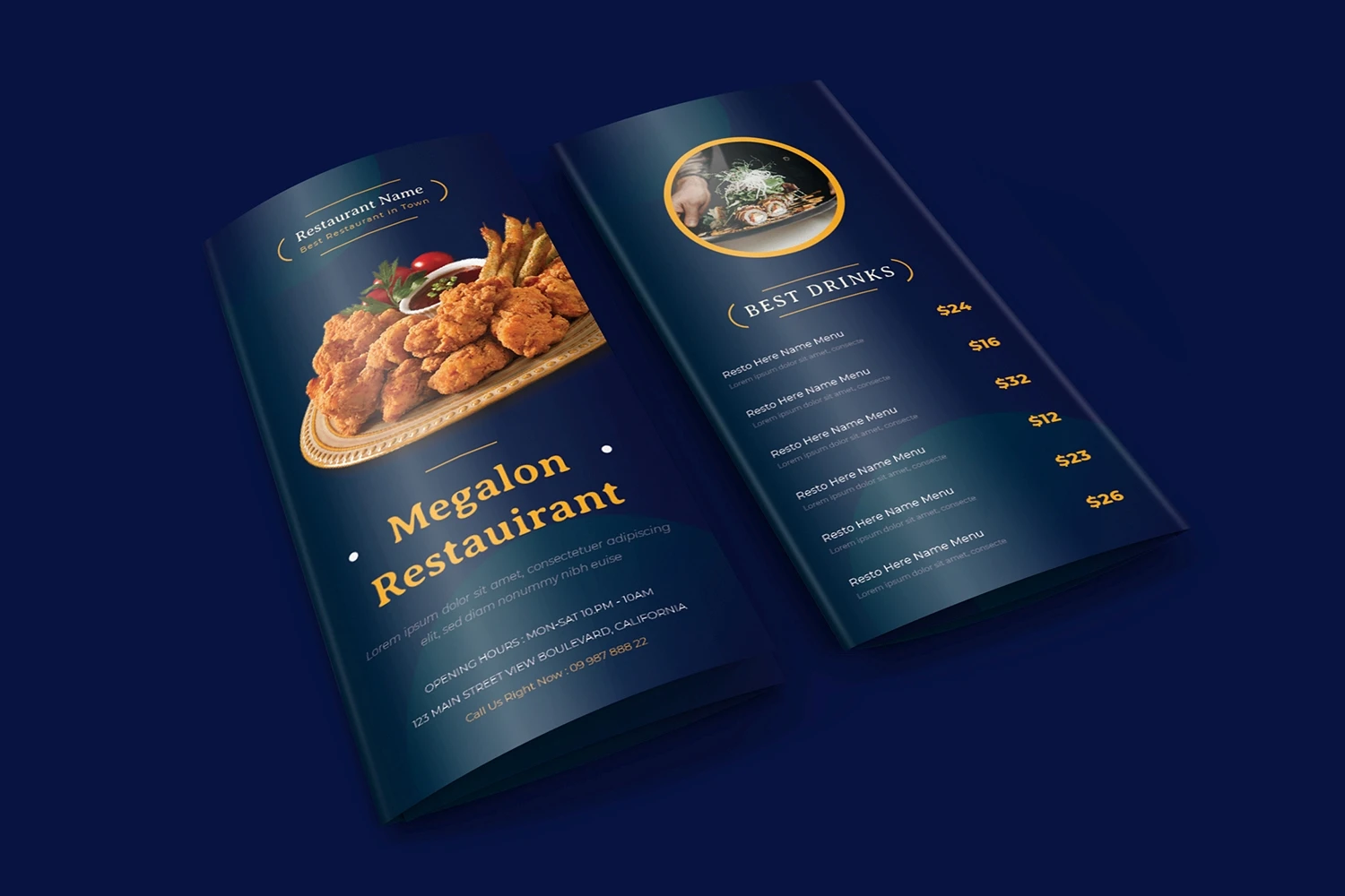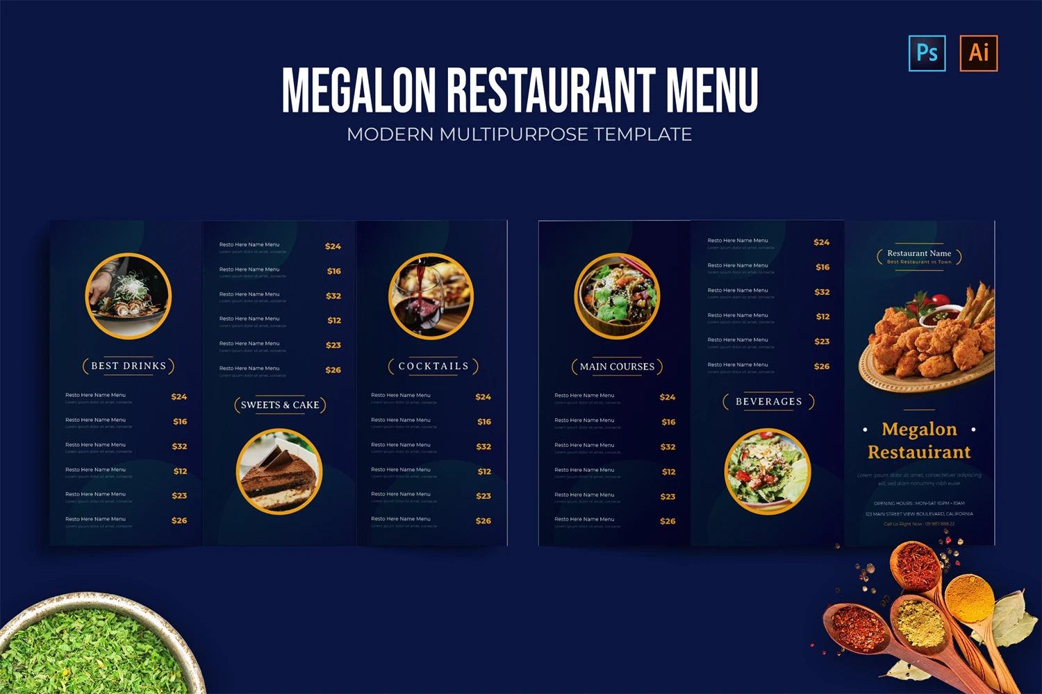 Megalon - Restaurant Menu. This template is great for your business and will make your customers interested, elegant, and easily editable according to your needs, this restaurant menu is perfect for, promos, cafes, hotels, resort shops online. etc. I hope you enjoy this restaurant menu