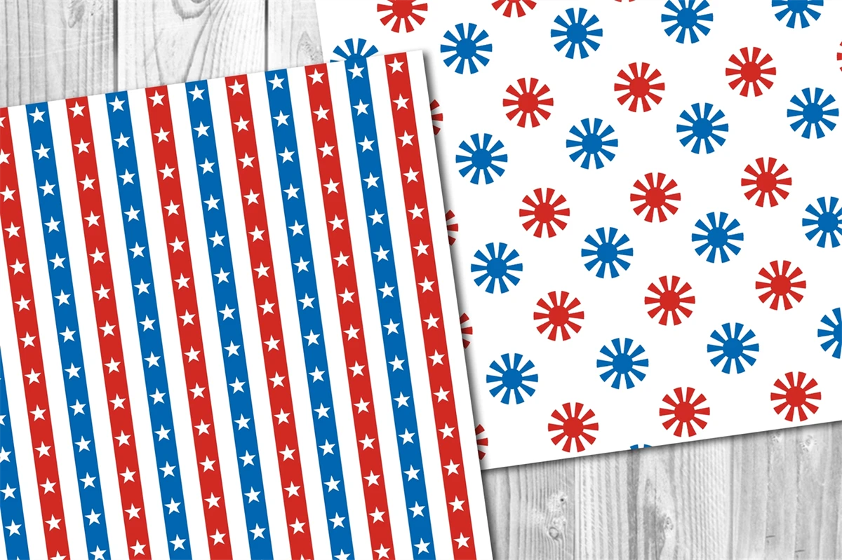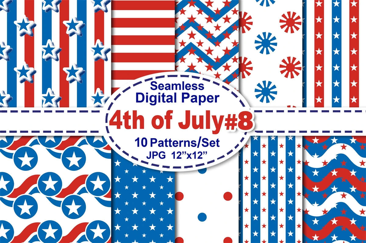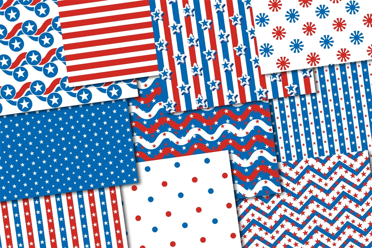 Memorial Day, Patriotic, Independence Day, 4th of July Digital Paper Set 8 - Stars & Stripes Red White and Royal Blue American Flag Theme Color Seamless Pattern Set