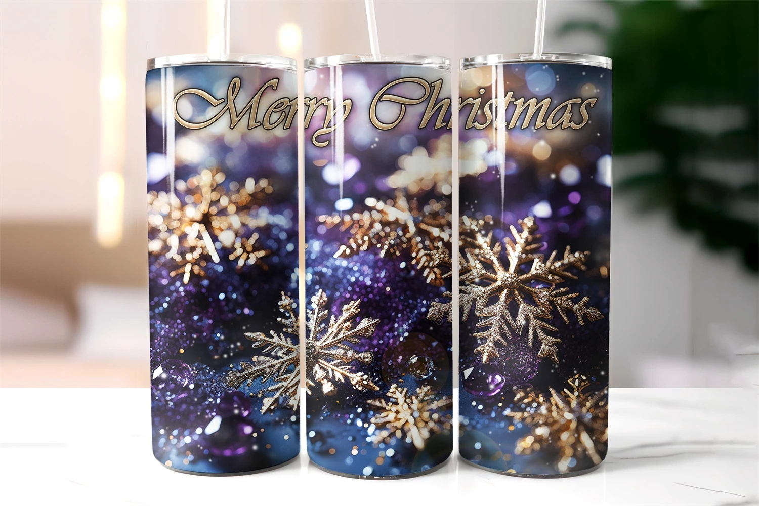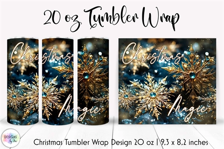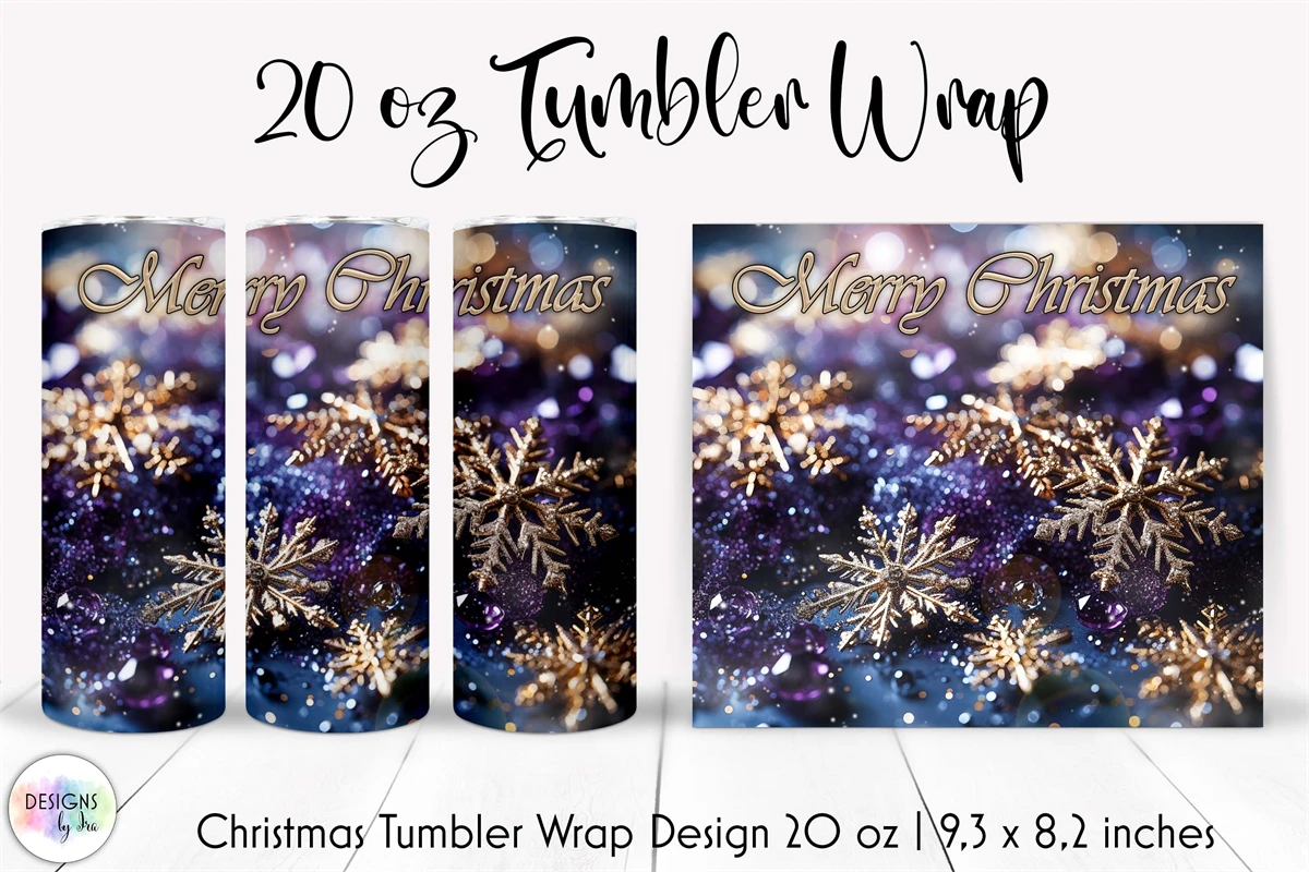 Beautiful Christmas tumbler wrap designs with shimmering snowflakes, stardust inspirational saying.