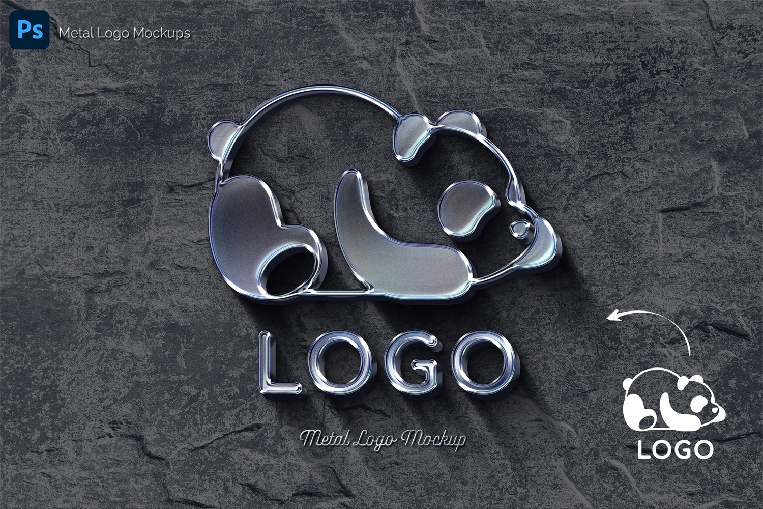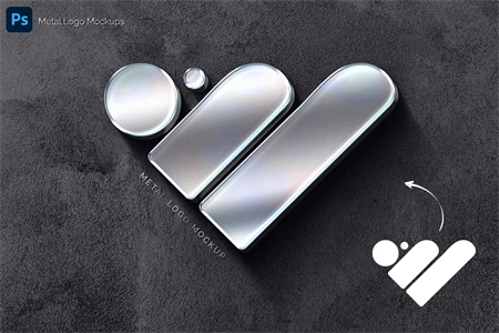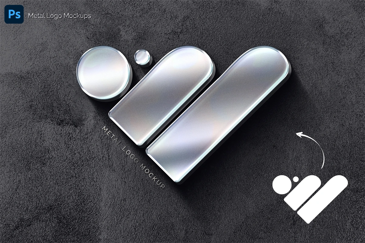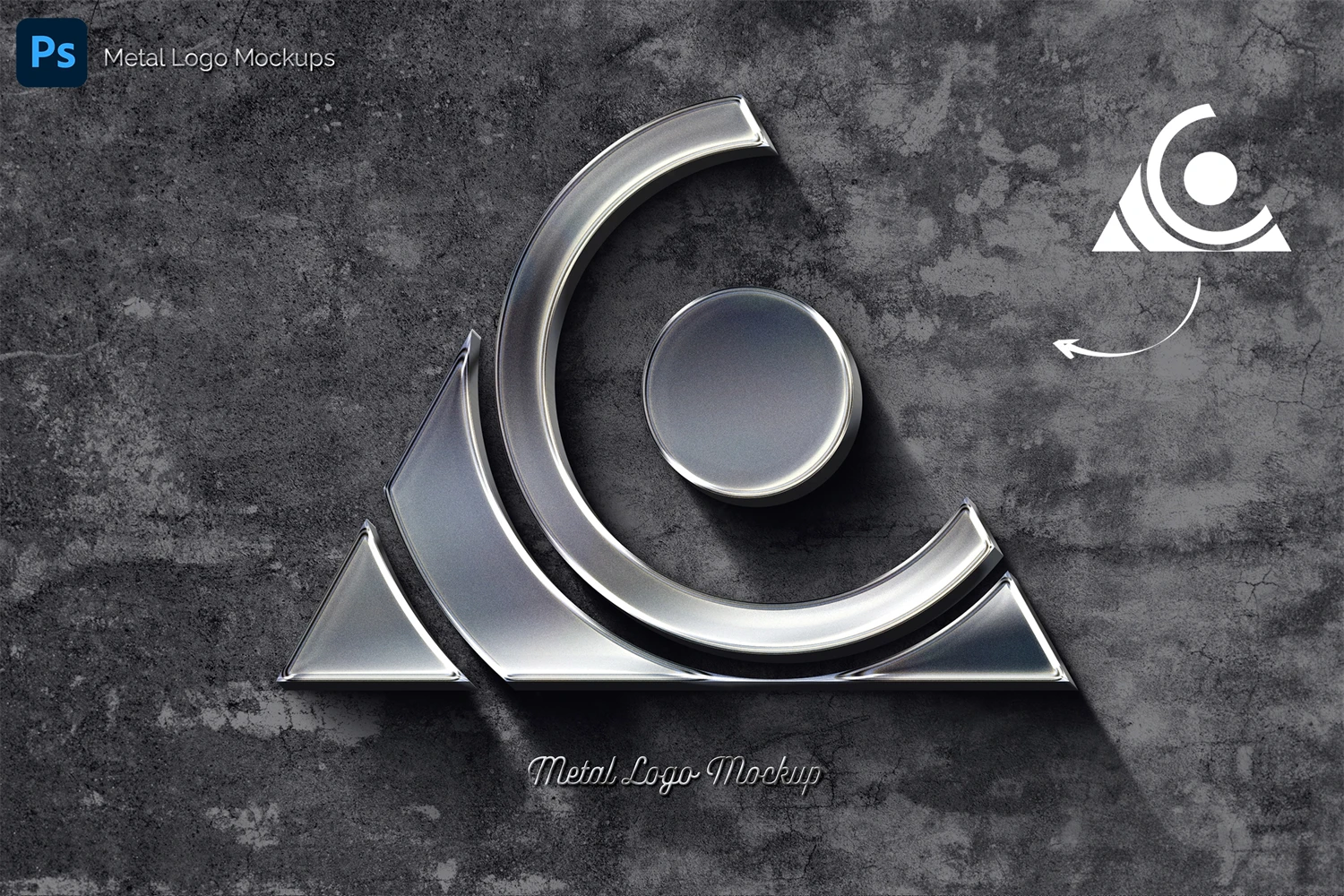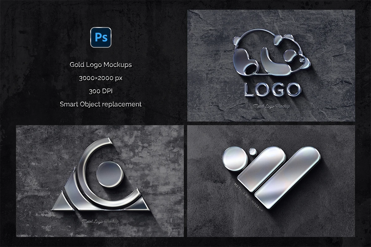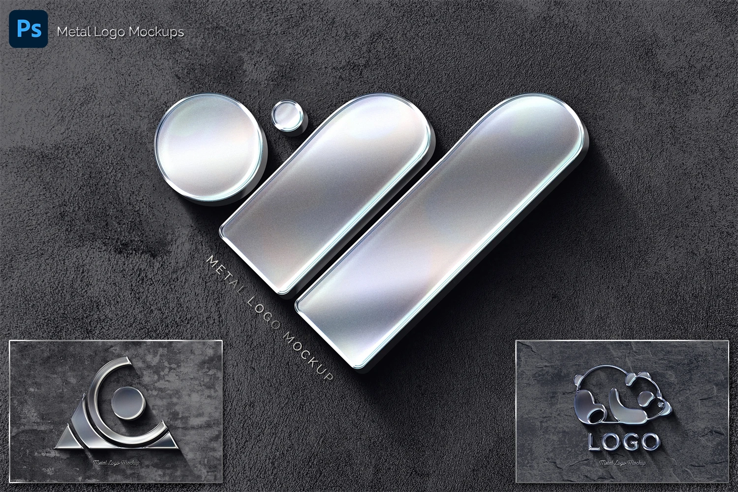 Introducing the Metal Logo Photoshop Mockups a collection that effortlessly transforms your logos into polished, chrome masterpieces. This set includes three meticulously crafted PSD templates, each featuring a chrome logo against a sophisticated grey wall texture, creating a modern and professional backdrop.