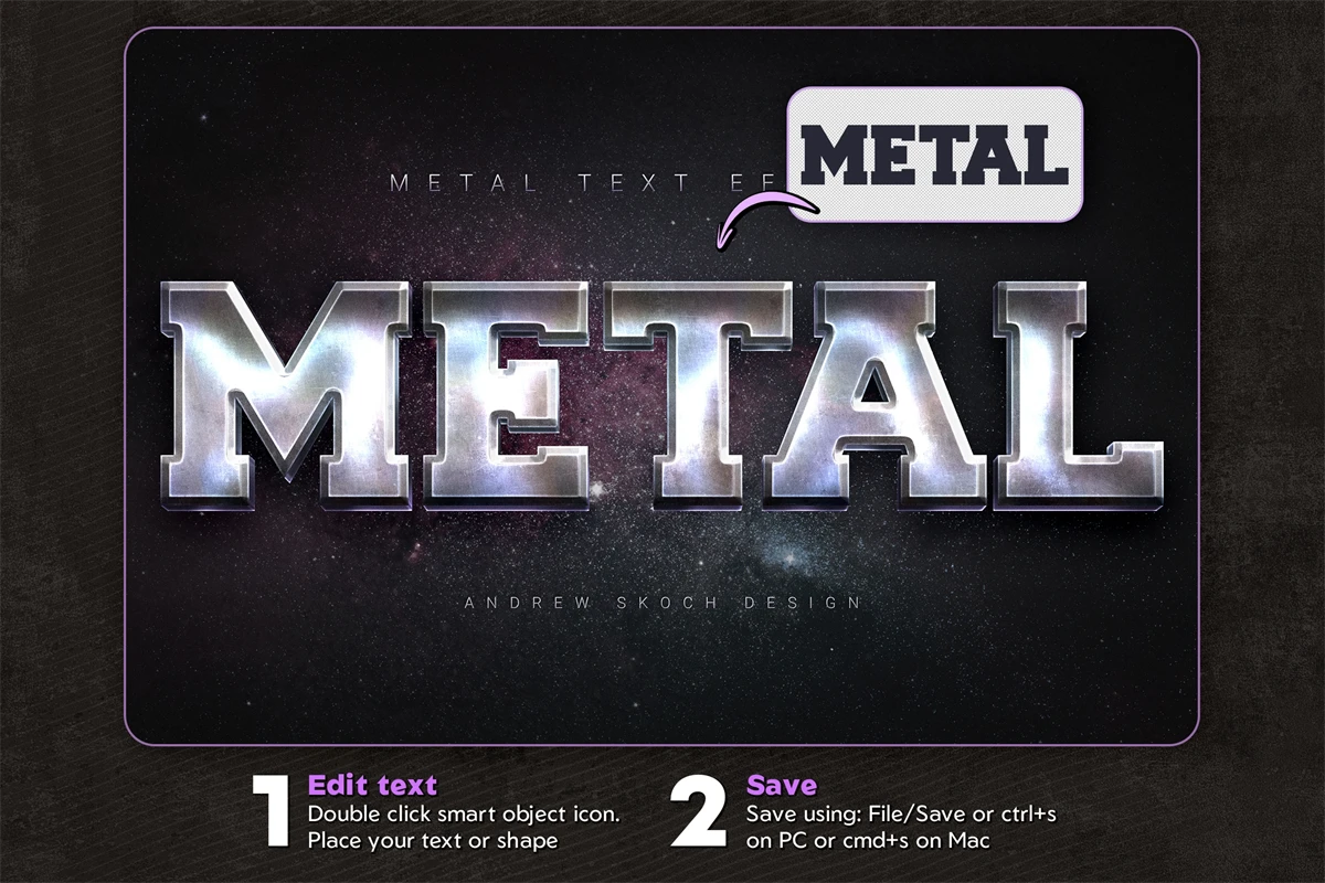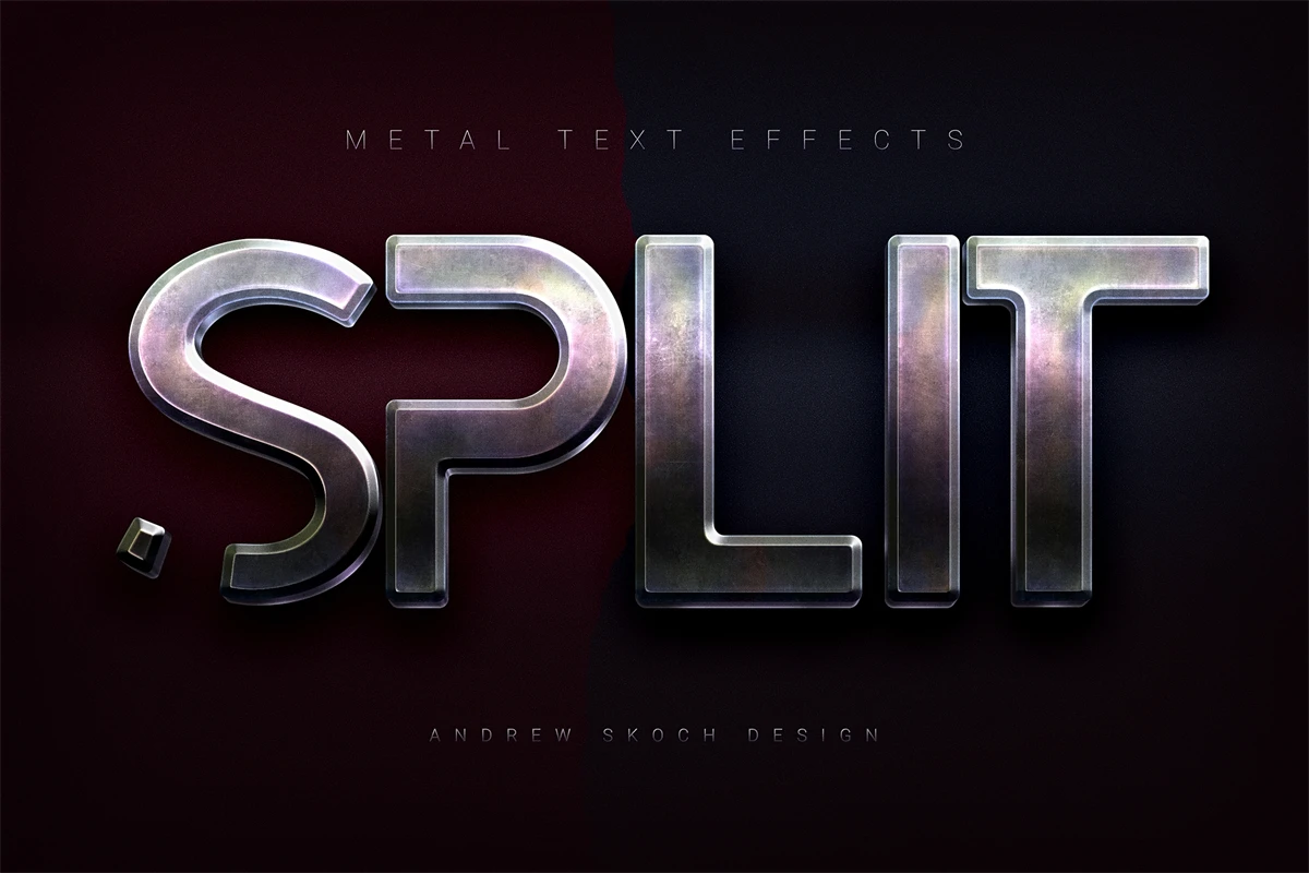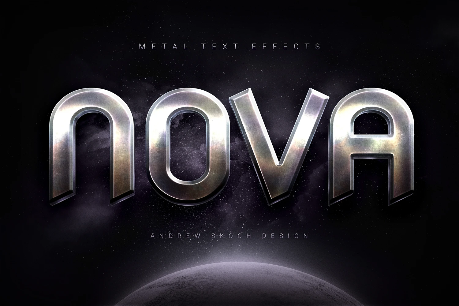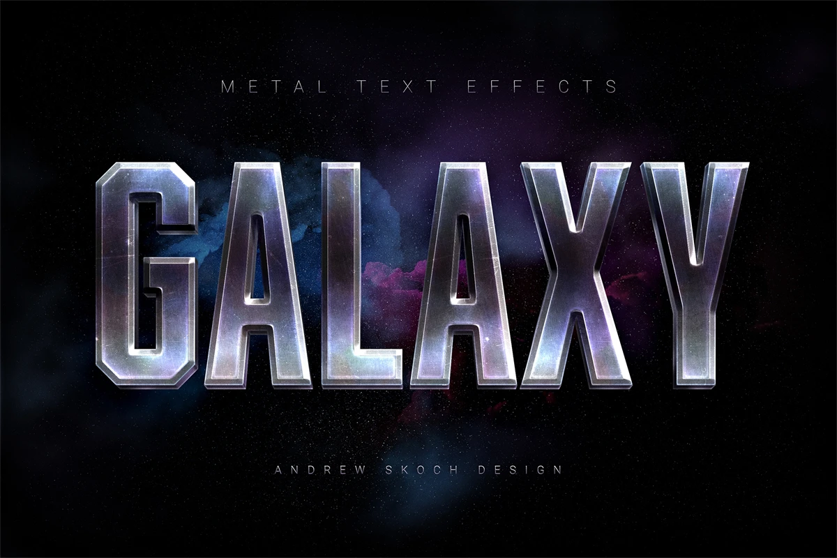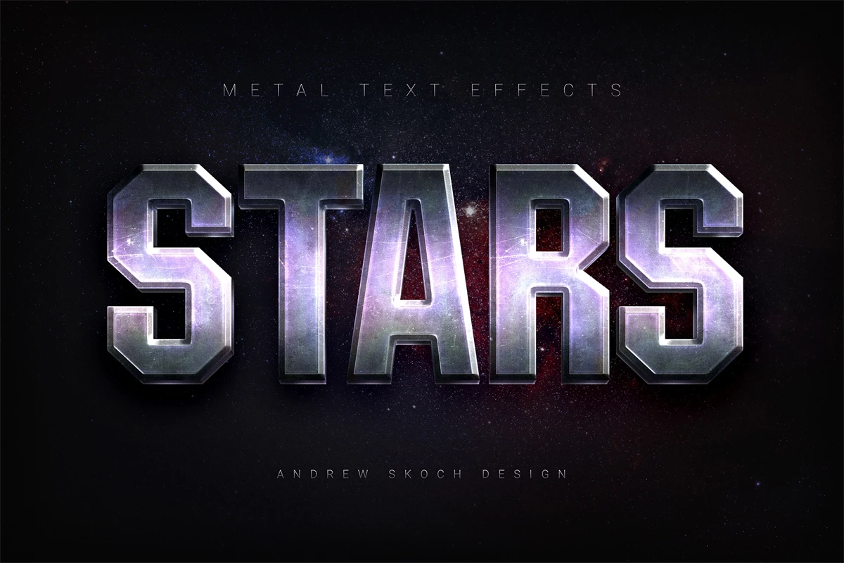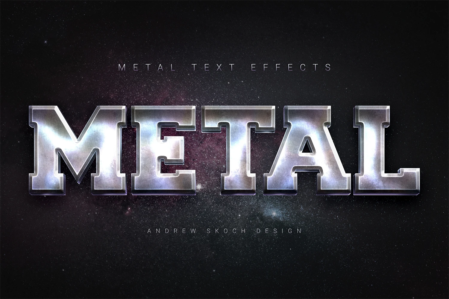 Elevate your digital designs with the sleek and industrial allure of Metal Text Effects. This versatile collection transforms ordinary text into metallic masterpieces, offering a spectrum of finishes, from brushed steel to polished chrome. Each effect is meticulously crafted to provide a realistic and striking appearance, making your typography stand out with a touch of modern sophistication.