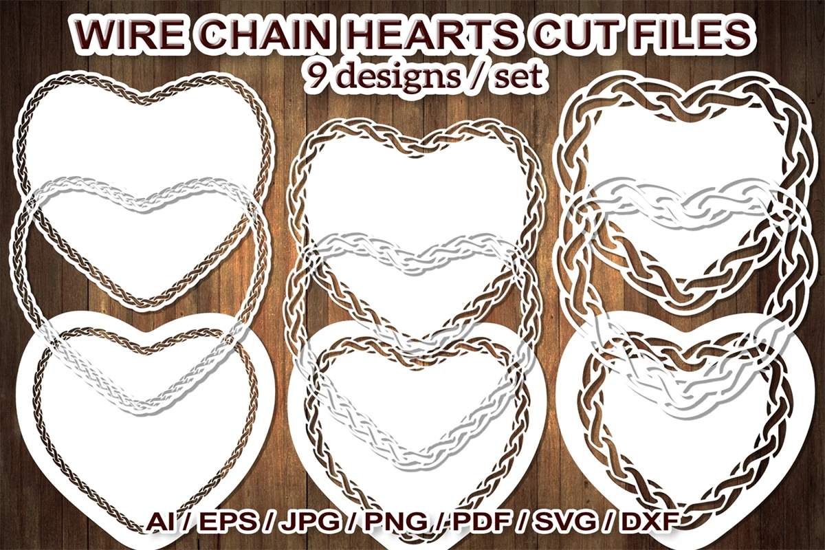 9 designs of metal wire chain heart shape border frames, SVG Clipart Cut Files for your creative DIY projects and Wedding Decor, or Home Decorations. Perfect for the papercut, scrapbooking, card stock, home decor, wedding decor, and other DIY projects. Options are endless! All designs are about 6x7 inches and come in black color which can easily change the color as your desire.