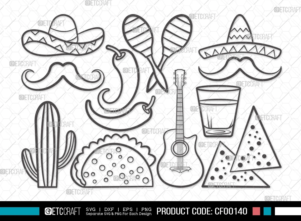 Elevate your crafting experience with this Mexican Outline SVG Cut File, featuring iconic elements like sombrero hats, maracas, mustaches, guitars, nachos, and tacos. Celebrate Cinco de Mayo and infuse a touch of Mexican culture into your projects. Compatible with a variety of design software and cutting machines, this SVG file is perfect for creating unique crafts.