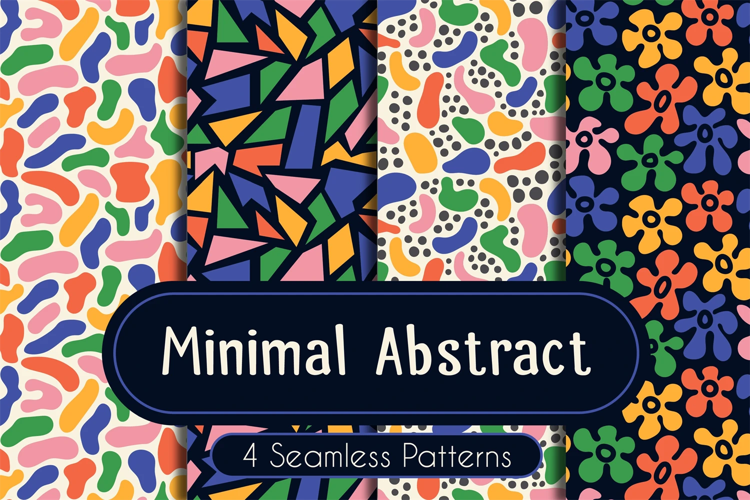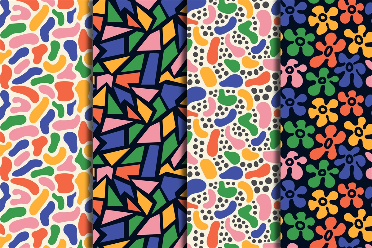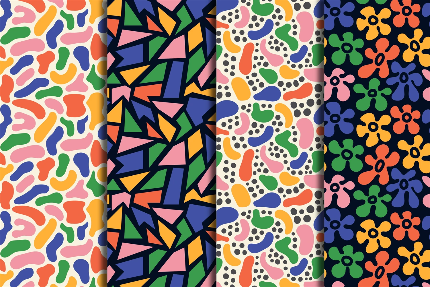 Retro Groovy abstract collection of seamless patterns. Playful colorful organic shapes, geometric elements, flowers, spots, dots. Minimal vintage wavy and liquid shapes. Childish creative digital papers with vibrant colors and trendy squiggles and doodles.