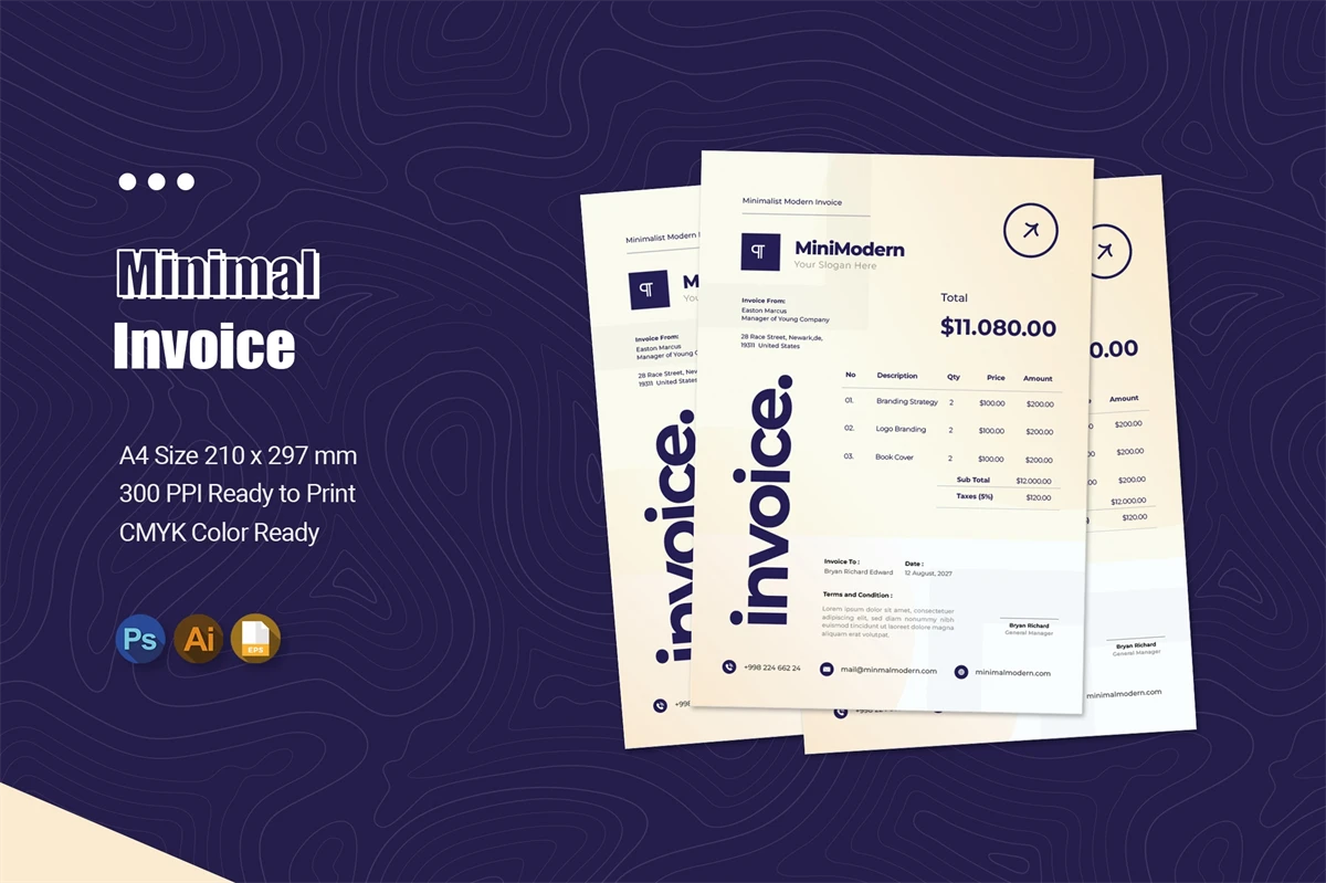 Use our invoices to make your bookkeeping easier and to impress your clients with an invoice display that has a modern, elegant design and strong typography. This invoice template is easy to use and customizable, making it perfect for any medium.