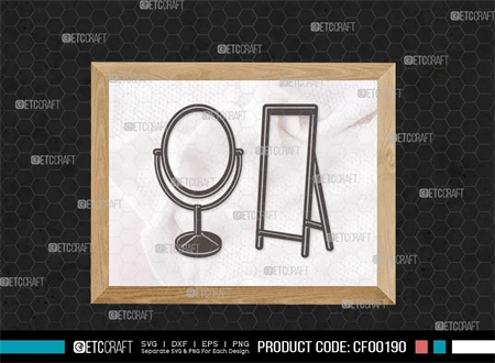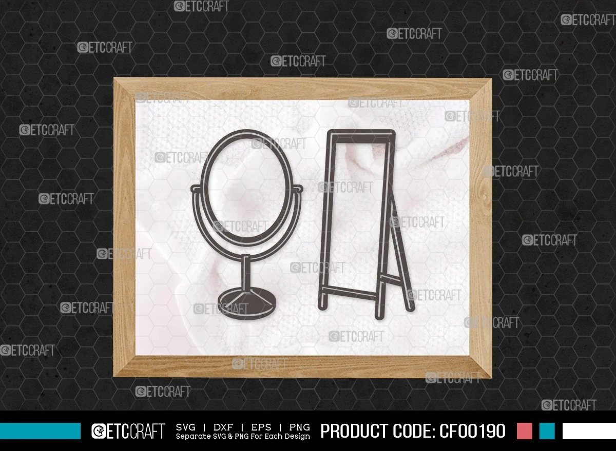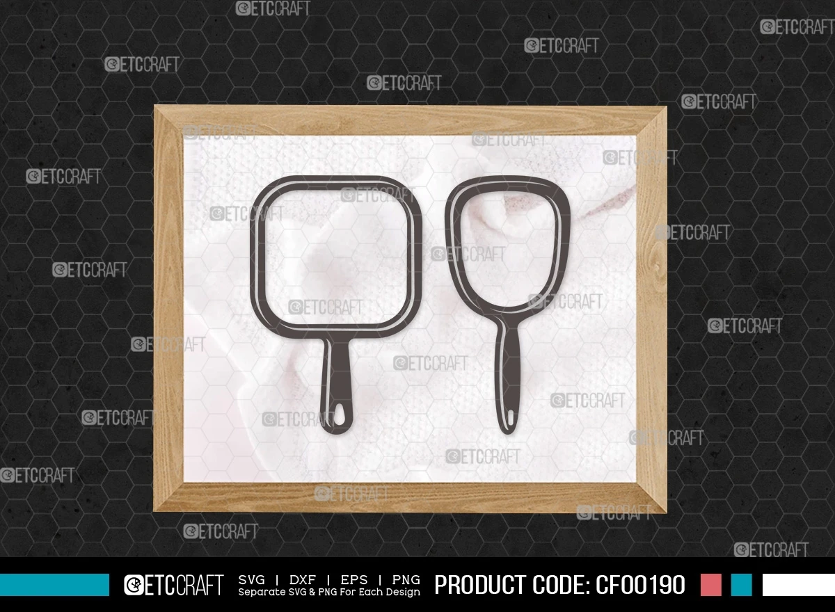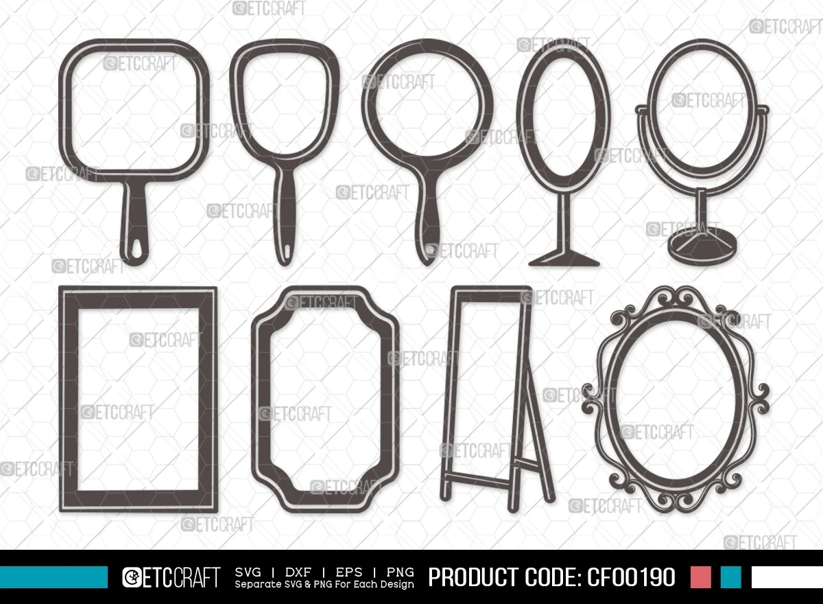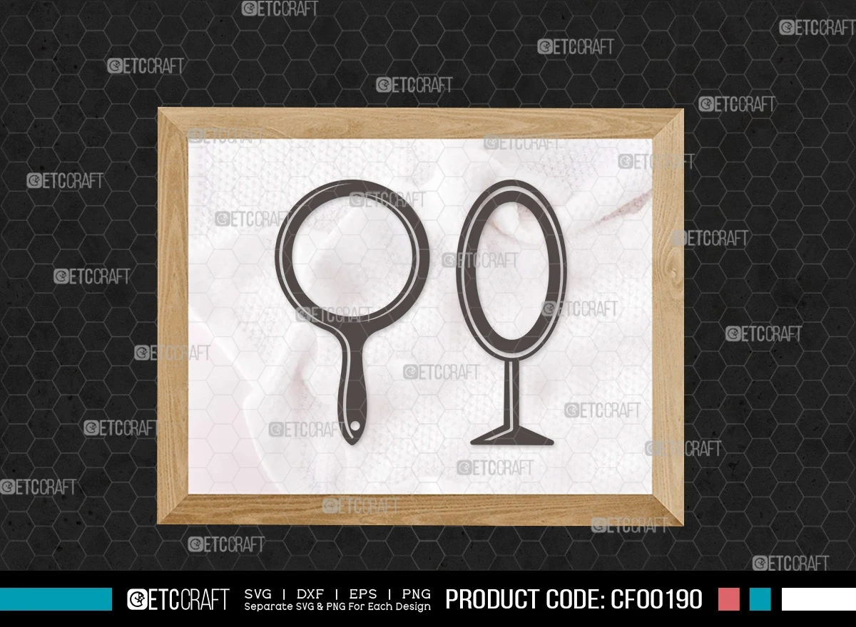 Upgrade your design projects with our Mirror Silhouette Fashion Cosmetic Compact Hand Mirror Frame SVG Cut File Bundle. Download now to infuse a touch of sophistication and style into your creative ventures!