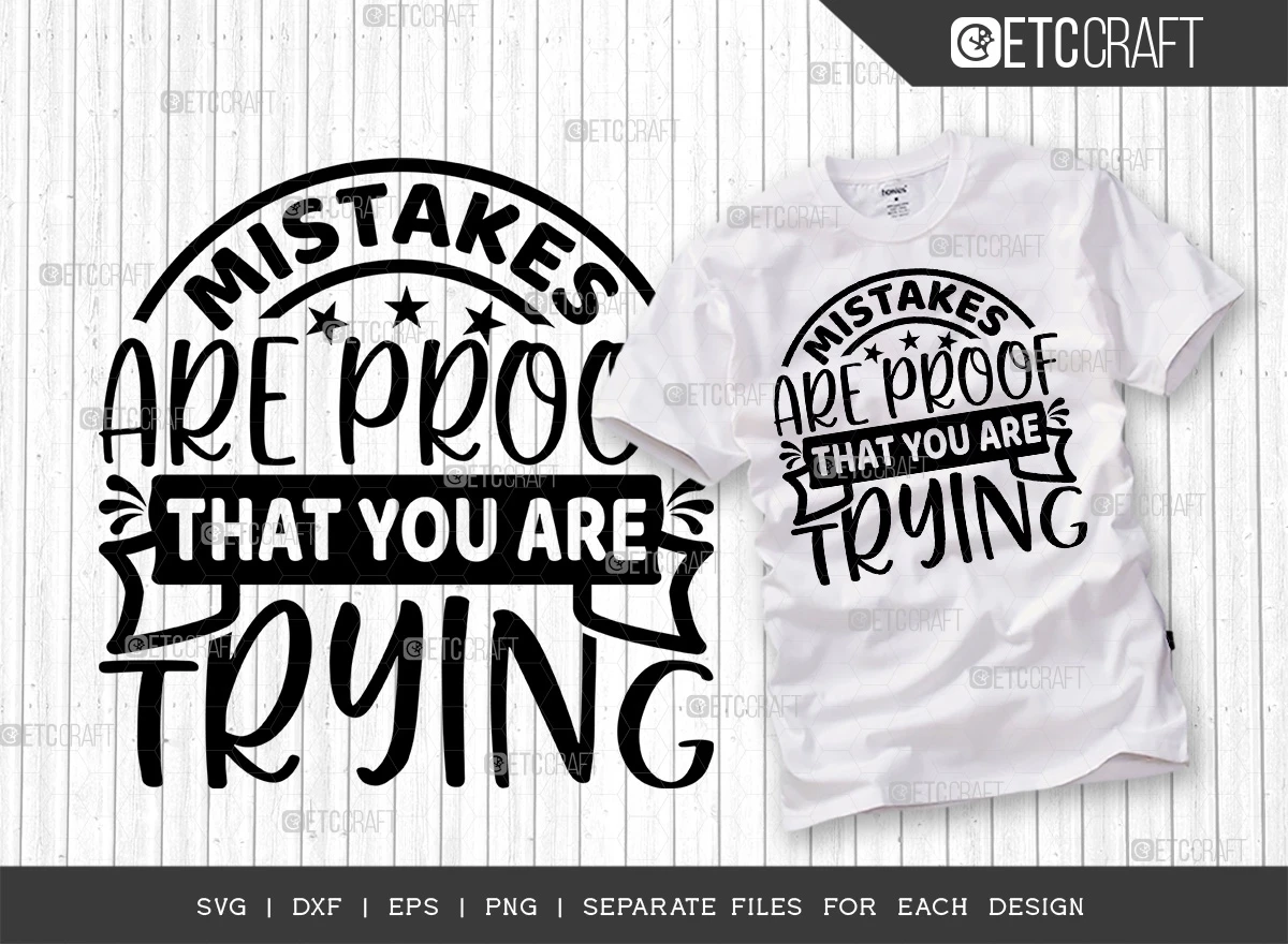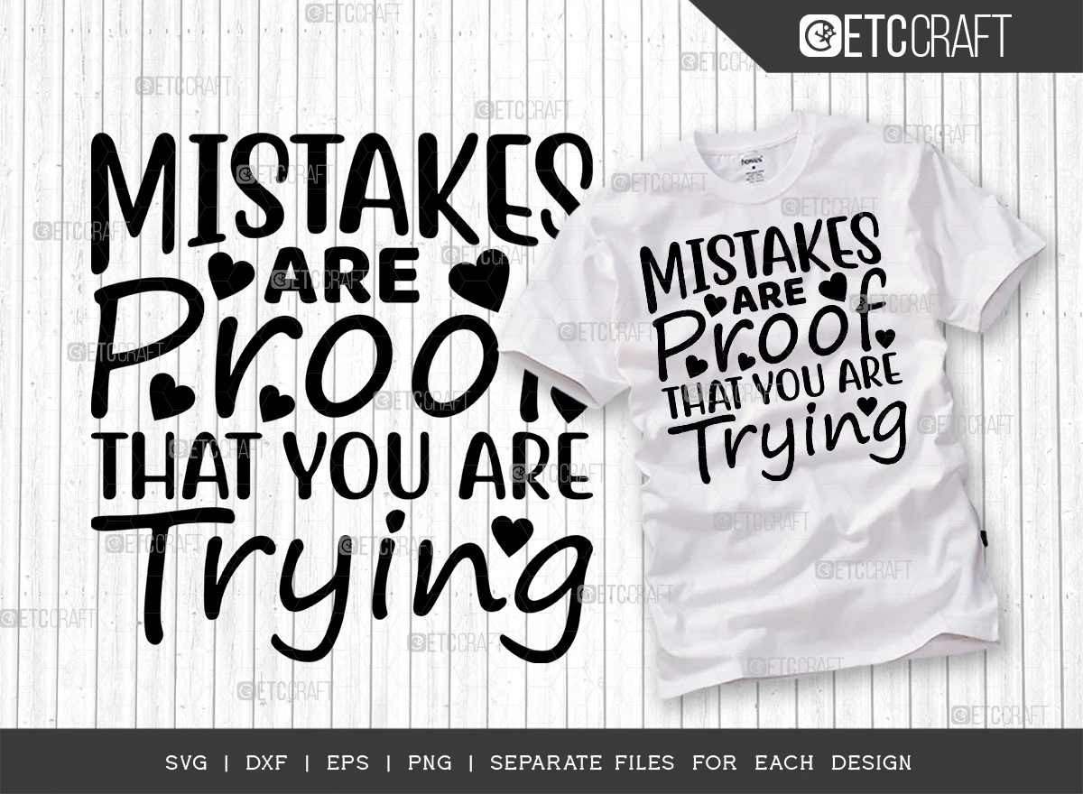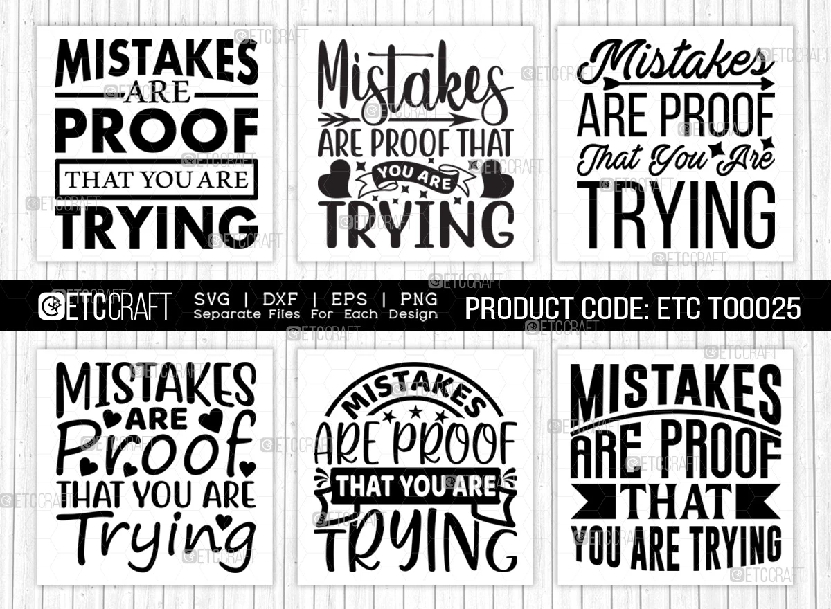 These Mistakes Are Proof That You Are Trying SVG Bundle is the perfect way to motivate yourself and others to keep trying, even when things get tough. The bundle includes 5 different SVG files, each with a different variation of the inspirational quote "Mistakes are proof that you are trying." You can use these files to create custom t-shirts, mugs, wall art, and more.