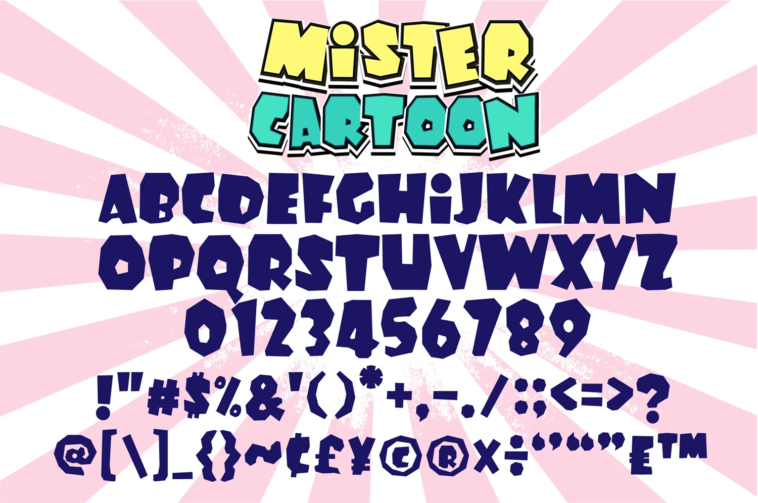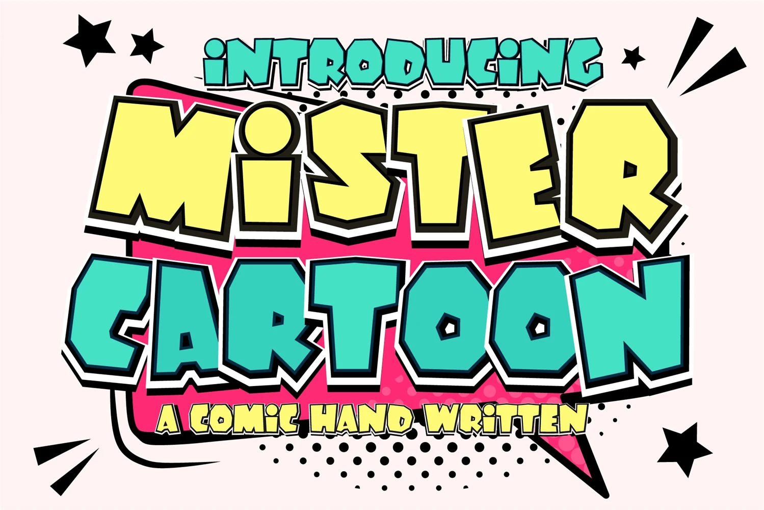 Mister Cartoon Font is a fun and thick lettered display font that exudes confidence, authenticity, and charm. This delightful typeface is perfect for conveying any message with a playful and lighthearted tone. Whether you're designing cartoons, magazine covers, games, or any project that needs a jolly touch, Mister Cartoon Font will bring joy and character to your creations. Its bold and expressive design will make your text pop, leaving a memorable impression on your audience. Let your imagination run wild and infuse your designs with the whimsical essence of Mister Cartoon Font!