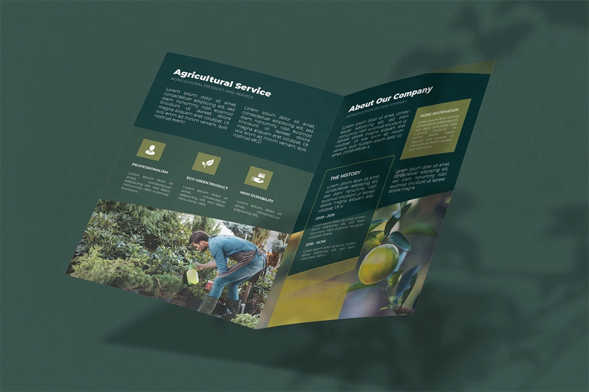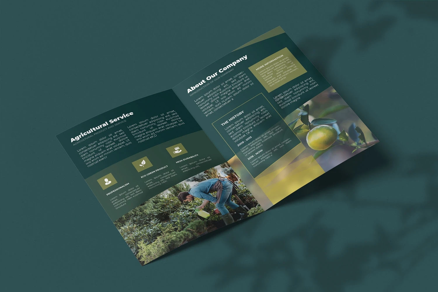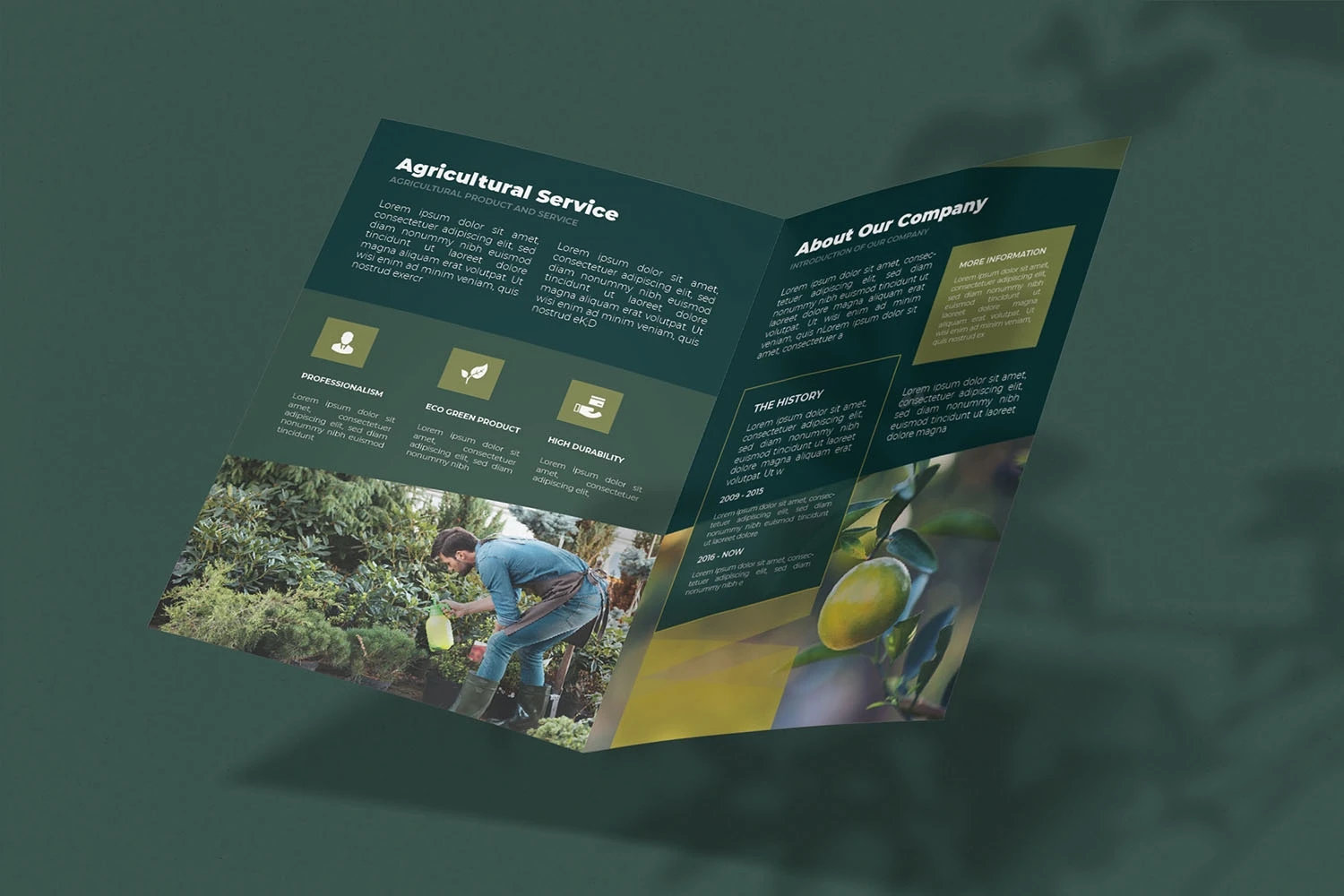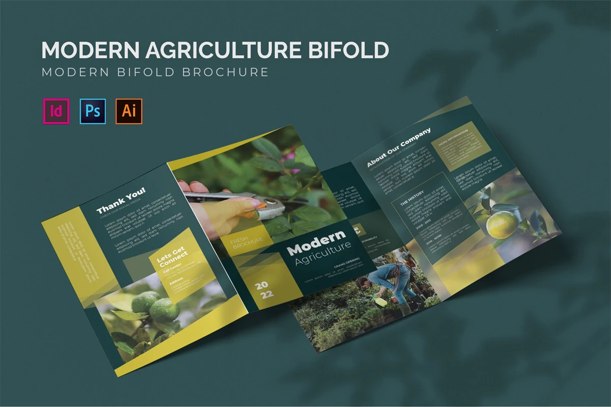 Modern Agriculture - Bifold Brochure We present this Bifold Brochure for you, simple and very elegant, and this Bifold Brochure is suitable for all types of your business, made with Adobe InDesign (INDD), Adobe Photoshop (PSD) and Adobe Illustrator (AI), very easy to customize, Hope you Like it, dont forget to rate, Thanks.