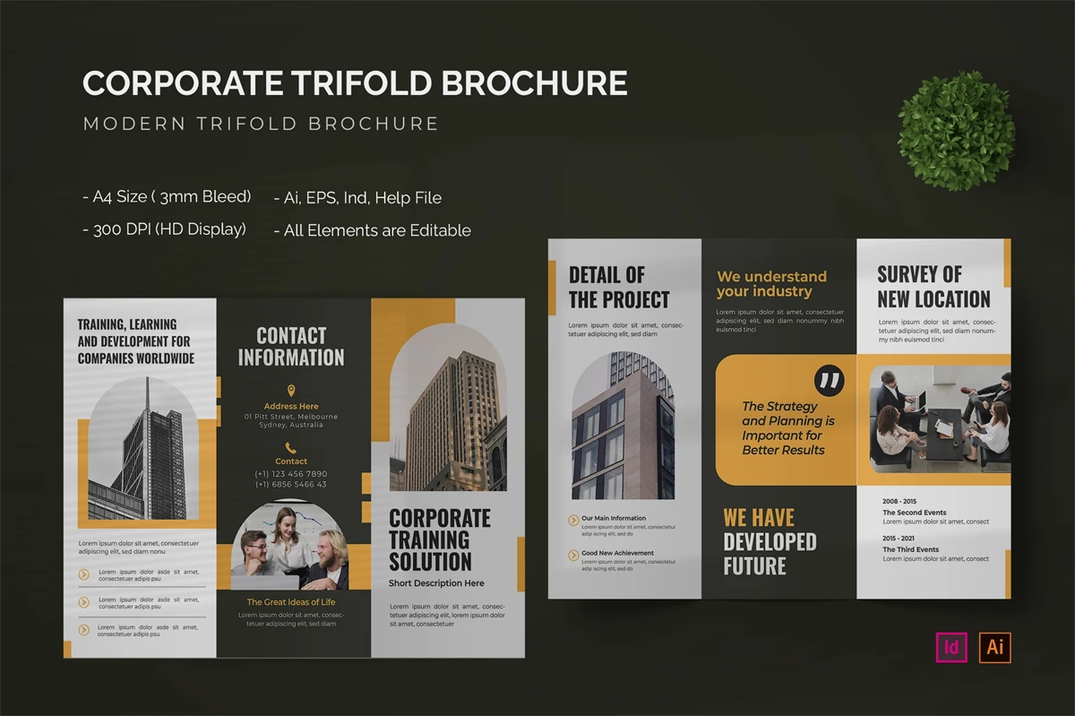 Modern Corporate - Trifold Brochure A trifold brochure is a type of corporate business flyer with a clean, simple, and professional style that is useful for promoting the goals of a project. This Brochure Project Is Perfect for Agency, Fashion, Creative, Magazine, Retail, Freelance, Business, and More! Dont worry, its very easy to be edited.