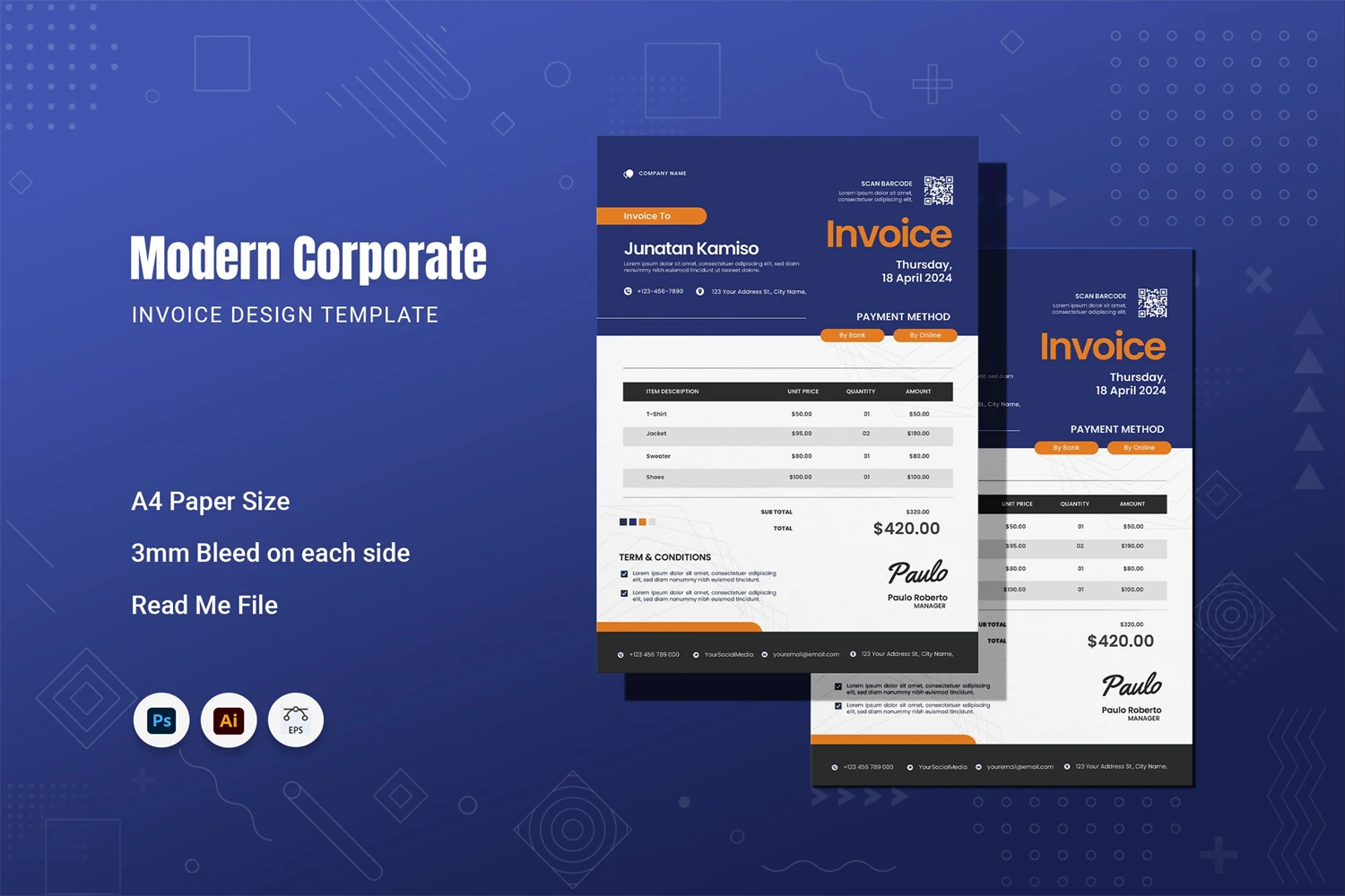 Each and every aspect holds significance within the realm of corporate affairs. Our invoice design template is poised to professionally showcase your brand. Your invoices will exude both style and practicality.