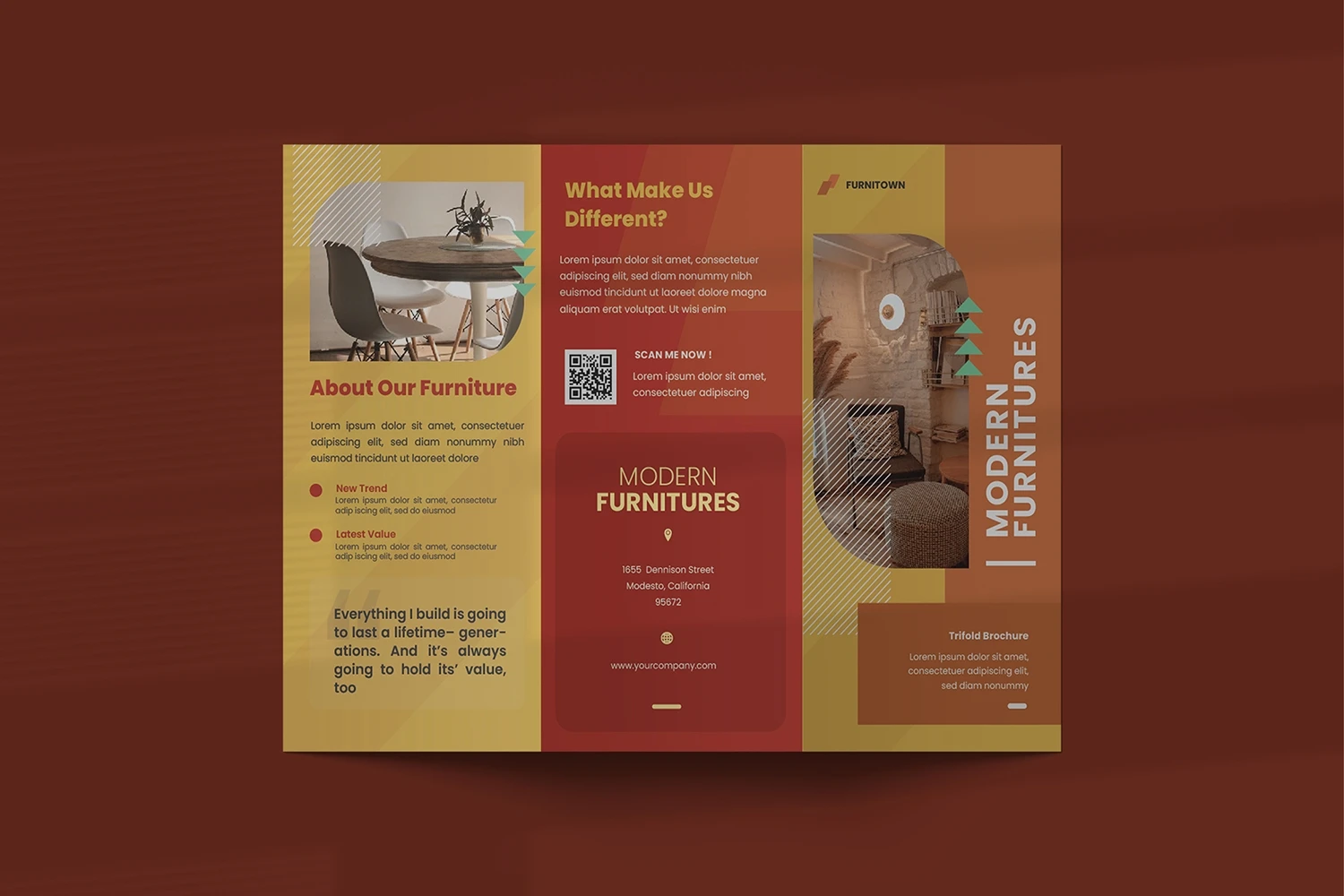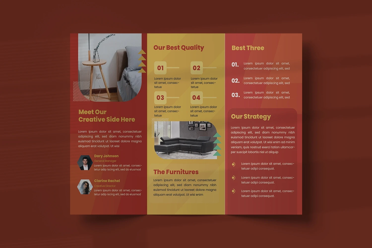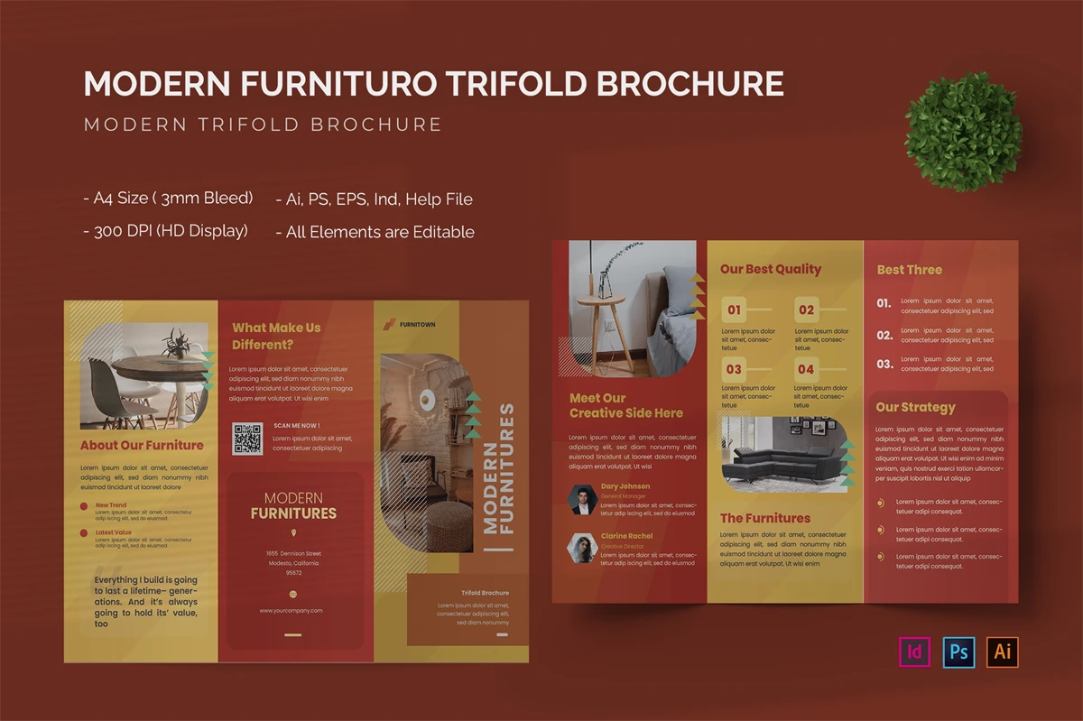 Modern Furnituro - Trifold Brochure We present this Trifold Brochure for you, simple, very elegant and professional and this Trifold Brochure is suitable for all types of your business,company or corporate, made with Adobe InDesign (INDD), Adobe Photoshop (PSD) and Adobe Illustrator (AI), very easy to customize, Hope you Like it dont forget to rate, Thanks You.