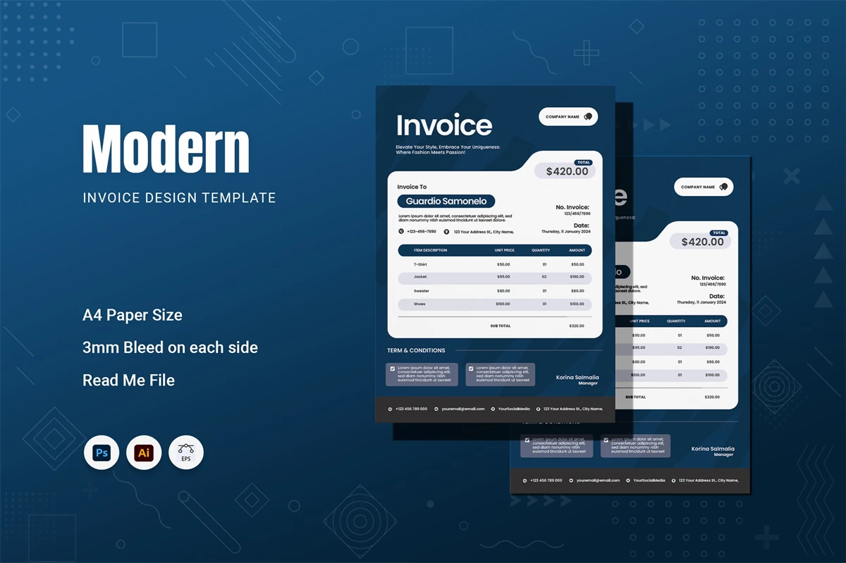 Each and every aspect holds significance within the realm of corporate affairs. Our invoice design template is poised to professionally showcase your brand. Your invoices will exude both style and practicality.