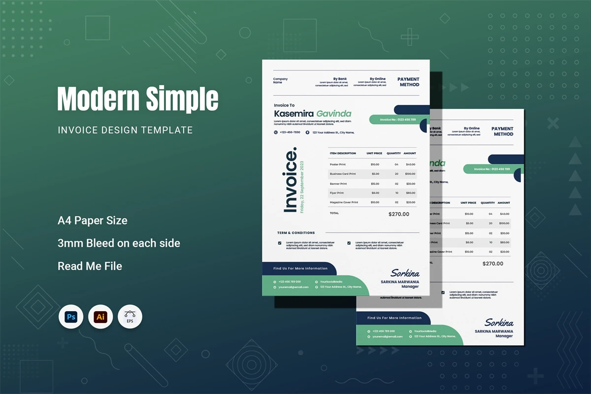 Each and every aspect holds significance within the realm of corporate affairs. Our invoice design template is poised to professionally showcase your brand. Your invoices will exude both style and practicality.