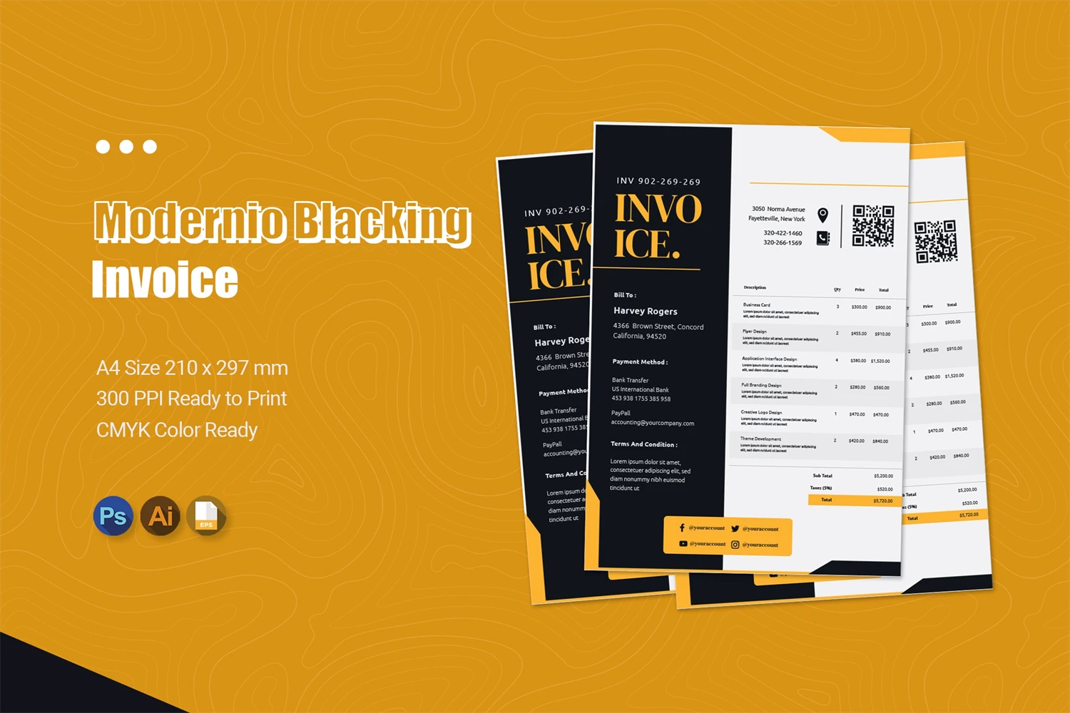 Use our invoices to make your bookkeeping easier and to impress your clients with an invoice display that has a modern, elegant design and strong typography. This invoice template is easy to use and customizable, making it perfect for any medium.
