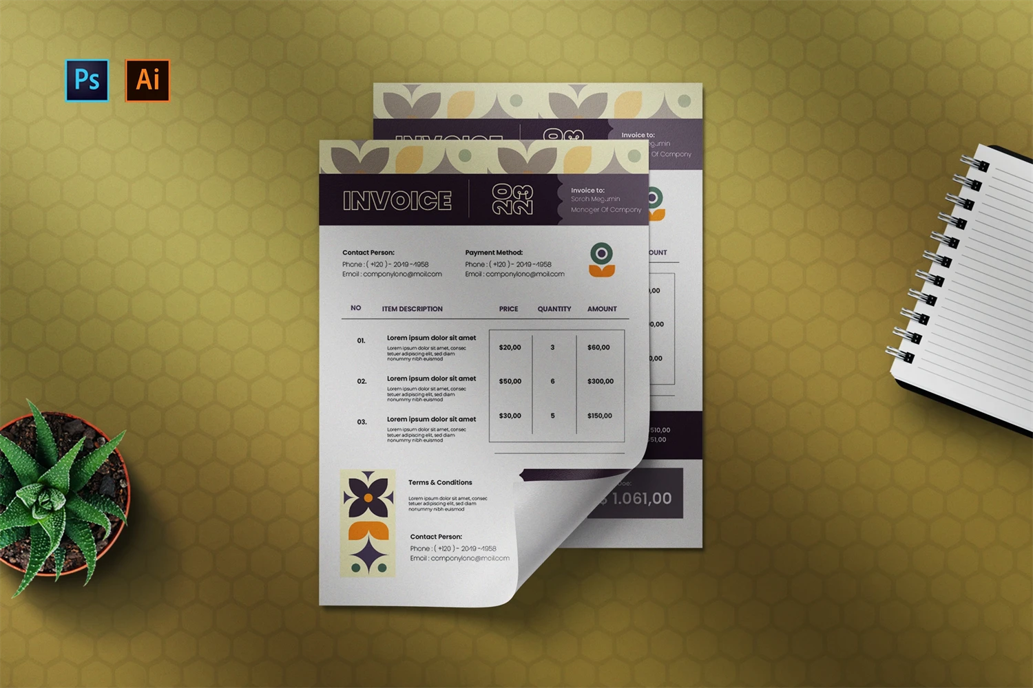 professional, up-to-date invoice templates that can be used for personal, business, or company billing. You can easily change these template files. You can quickly change the text, fonts, and colors with just a few clicks to create your own content and color scheme. This invoice template will make it easy and quick for you to make an invoice.