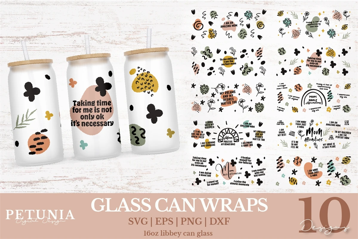 Mom Daily Affirmations Glass Can Wrap SVG Bundle for 16 Oz Can Glass can be used with Silhouette Studio, Cricut Design Space, Brother Scan N Cut, and other design software programs that can open SVG, DXF, and PNG files.