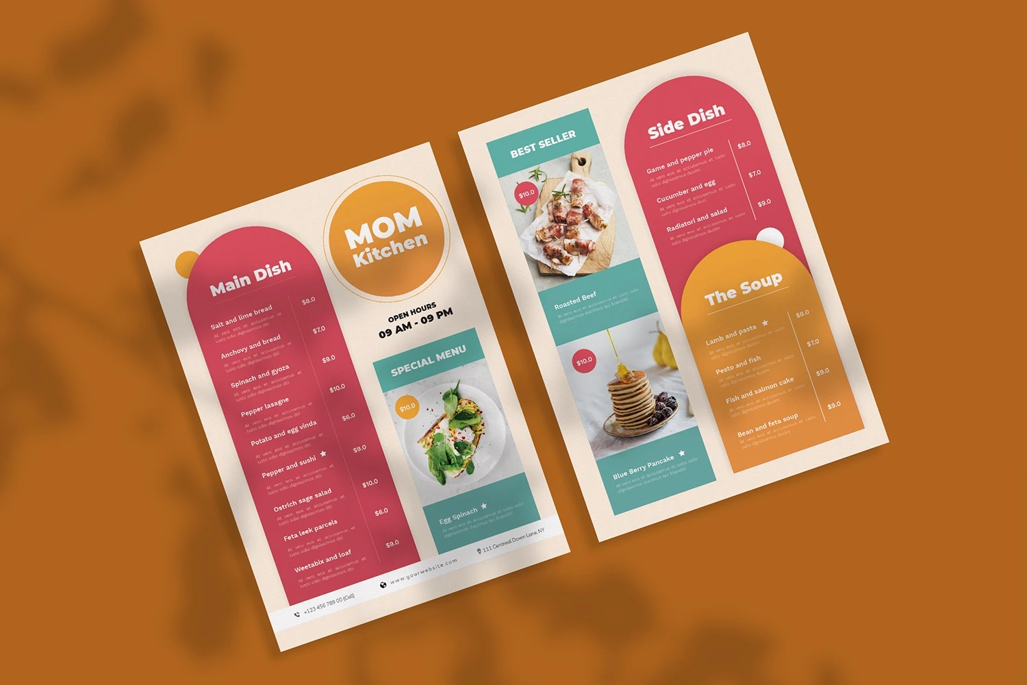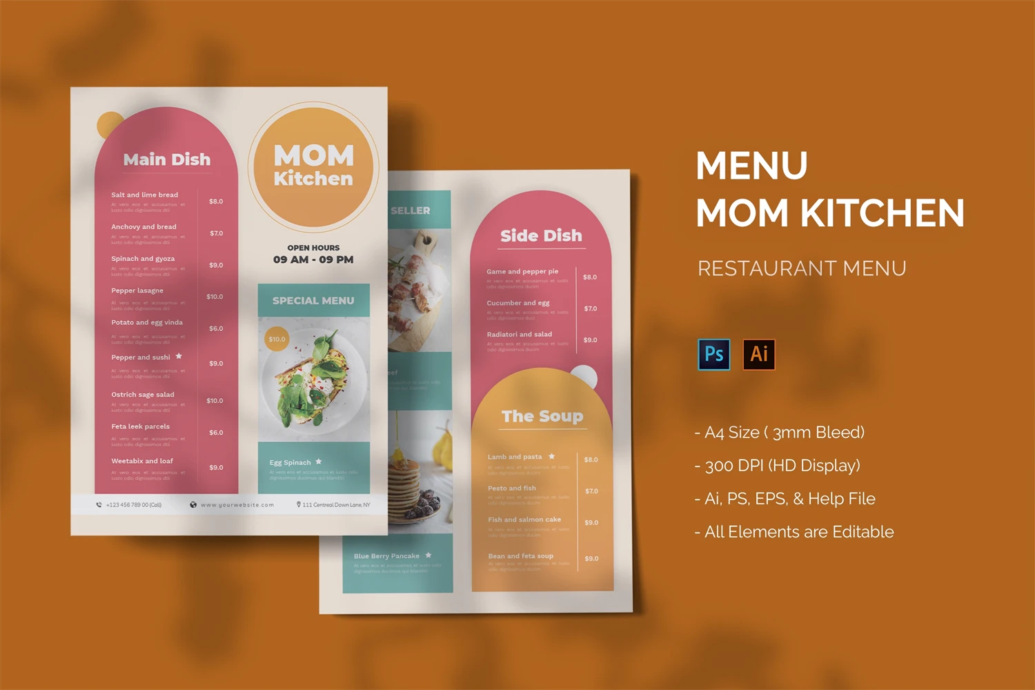 Mom Kitchen - Restaurant Menu. This template is great for your business and will make your customers interested, elegant, and easily editable according to your needs, this restaurant menu is perfect for, promos, cafes, hotels, resort shops online. etc. I hope you enjoy this restaurant menu