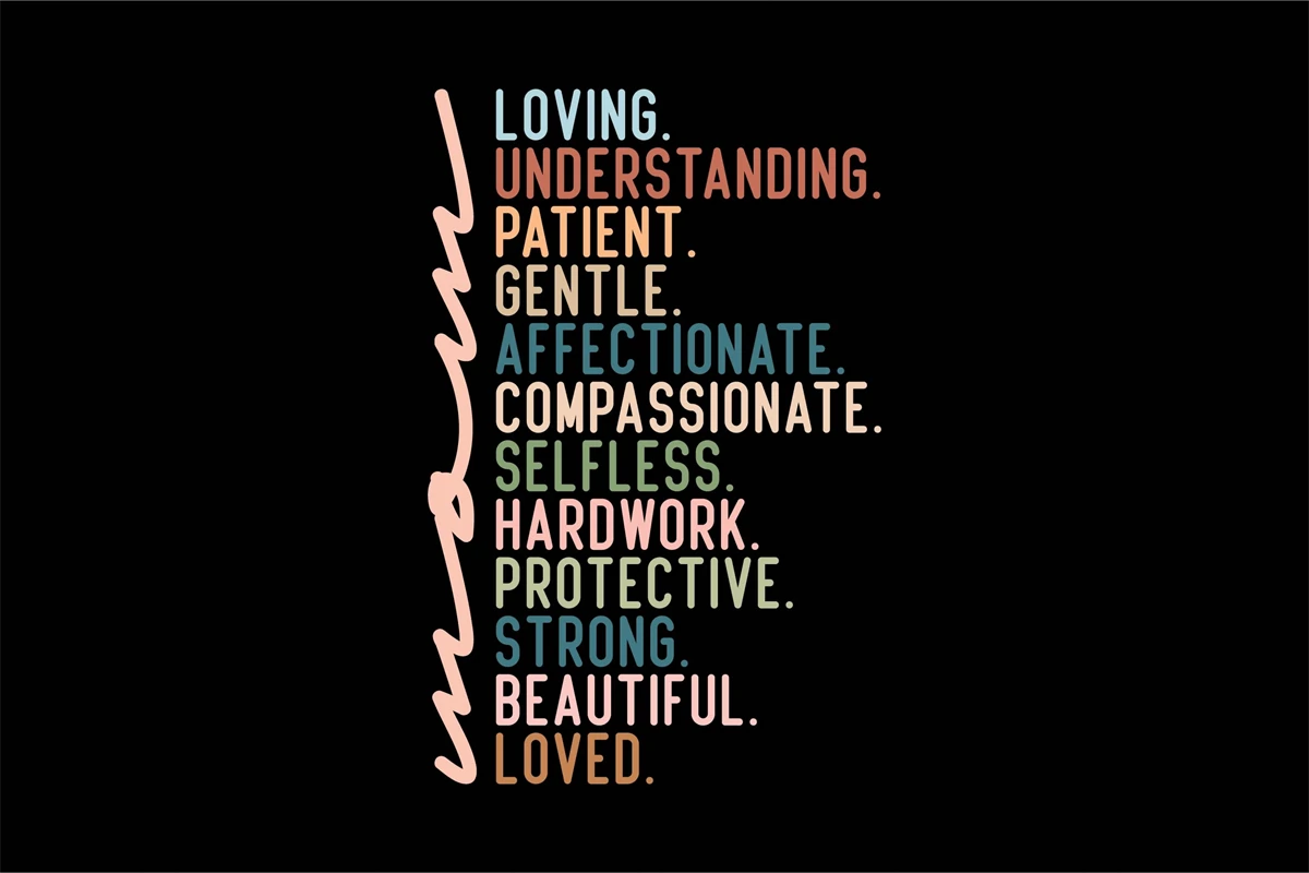 MOM Loving.understanding.patient.gentle.affectionate.compassionate.selfless.hardwork.protective.strong.beautiful.loved. T-Shirt Ready Home Print.