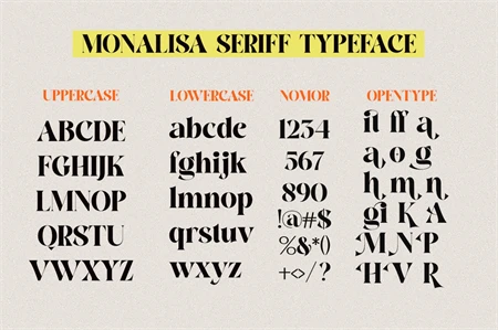 Monalisa Serif Typeface font is an elegant serif typeface with subtle details. This neat font can add modern and fashionable brand appeal. This versatile display typeface has enough character for logos and branding, as well as headlines, apparel, bridal and more. Keep it classic, or decorate it with ornate alternatives to uppercase and lowercase glyphs!