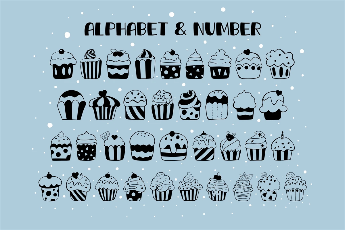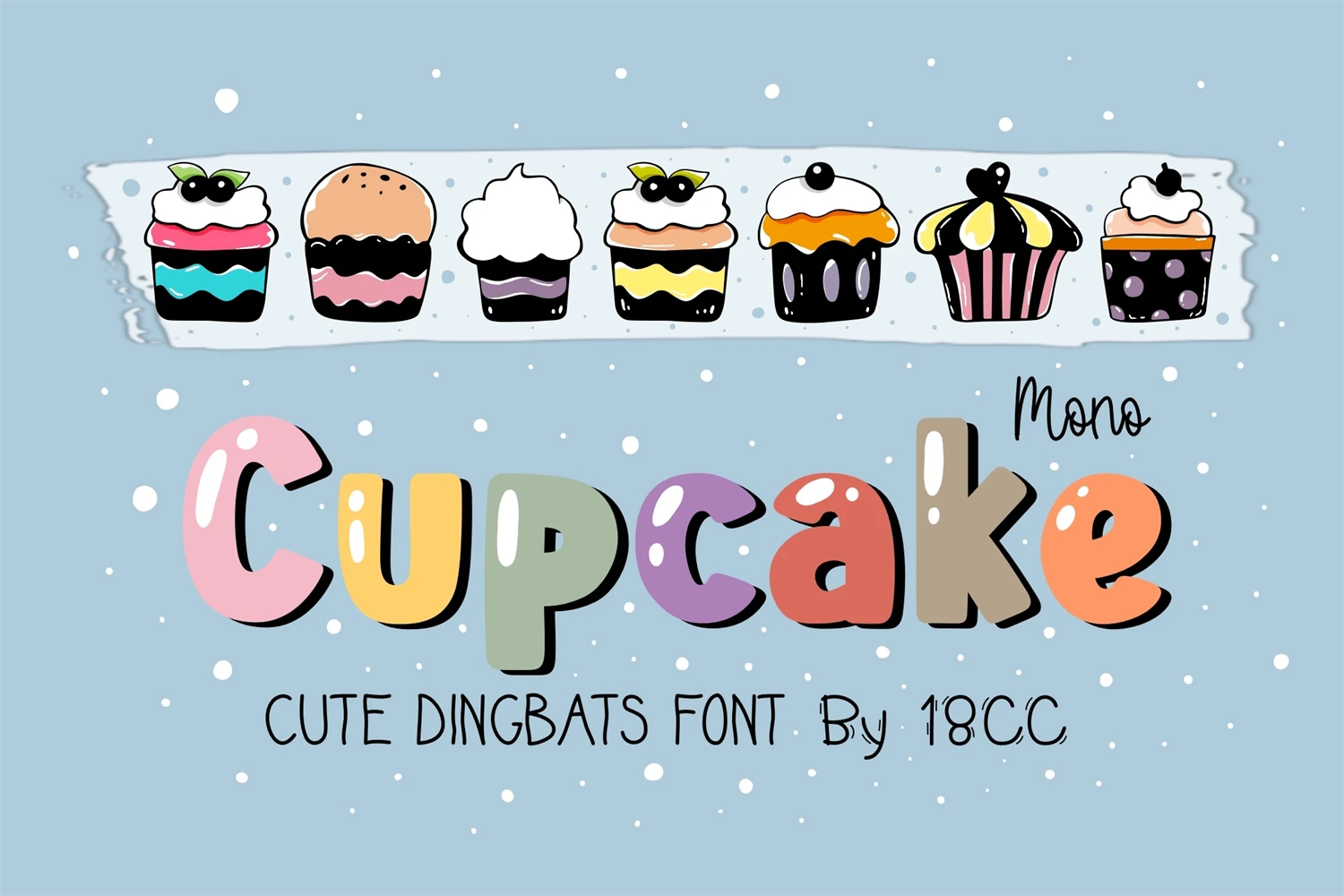 Mono Cupcake is a funny dingbats font. This font is the perfect fit for all of your logos, wall art, signs, cards, art prints, t-shirts, coloring page, and much more!