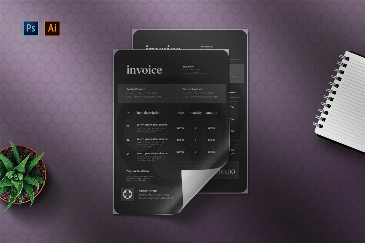 professional, up-to-date invoice templates that can be used for personal, business, or company billing. You can easily change these template files. You can quickly change the text, fonts, and colors with just a few clicks to create your own content and color scheme. This invoice template will make it easy and quick for you to make an invoice.