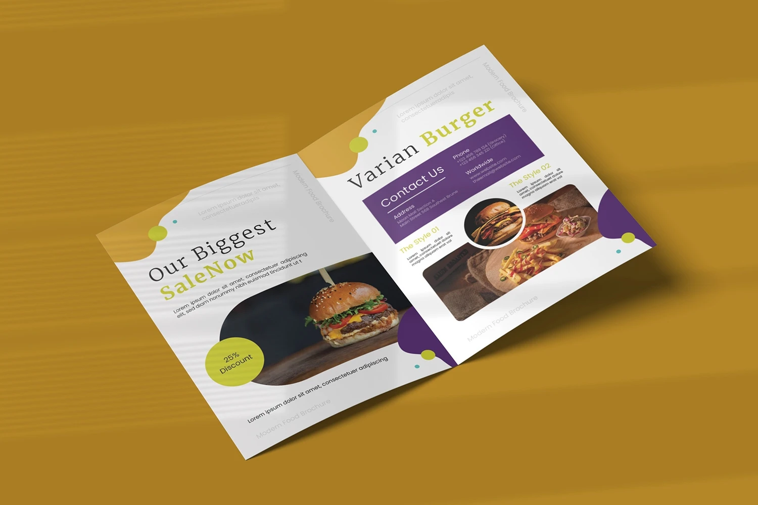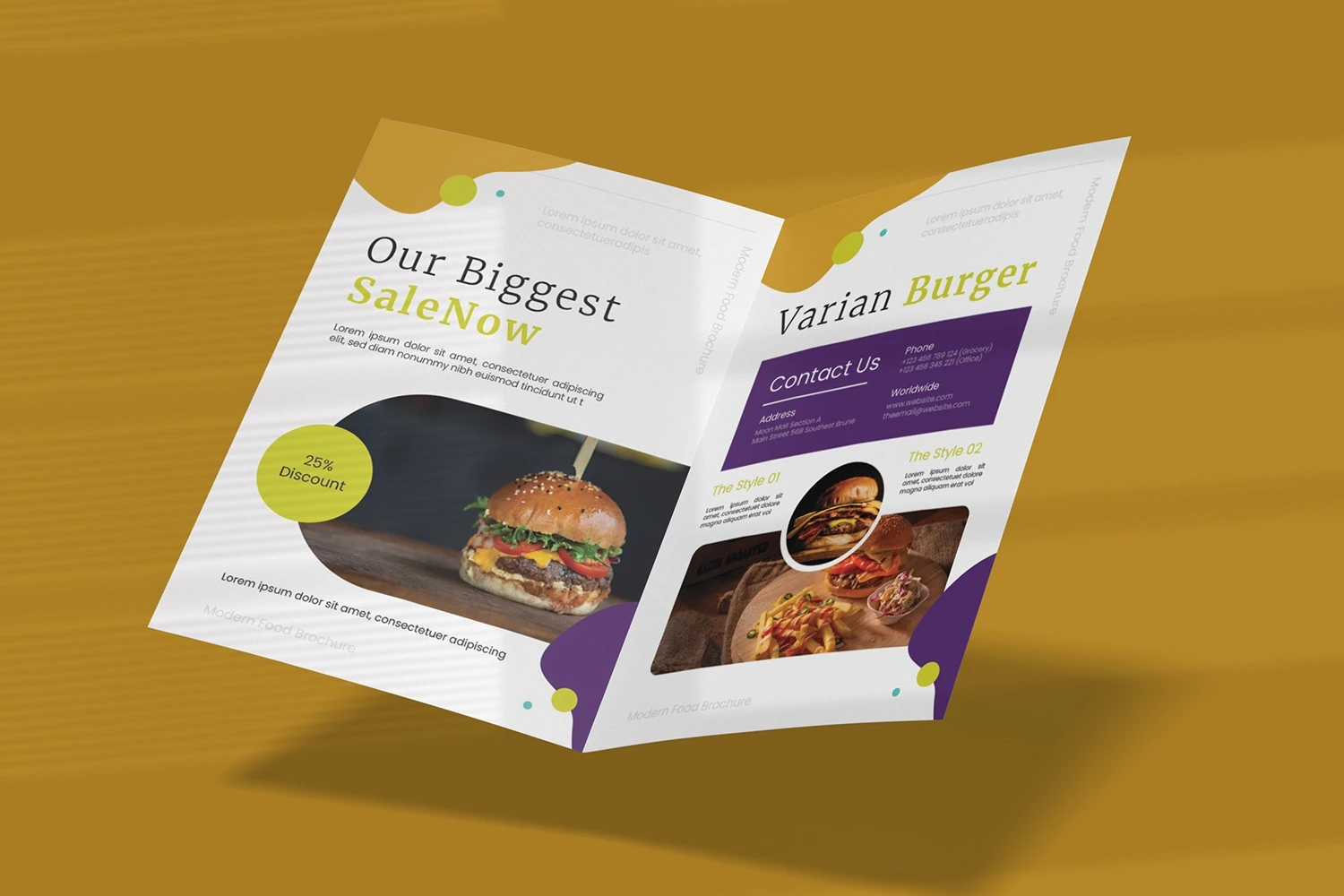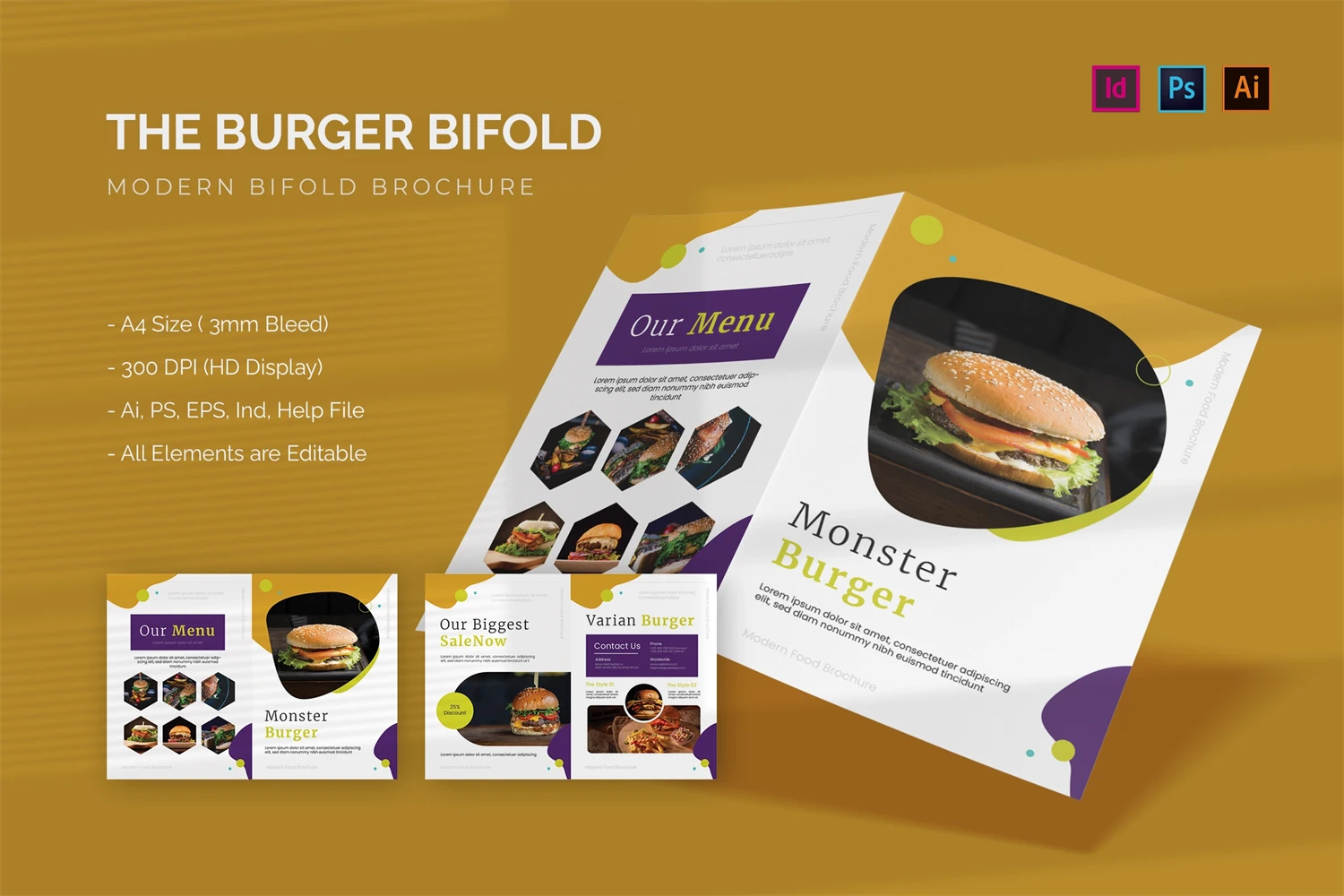 Monster Burger - Bifold Brochure We present this Bifold Brochure for you, simple and very elegant, and this Bifold Brochure is suitable for all types of your business, made with Adobe InDesign (INDD), Adobe Photoshop (PSD) and Adobe Illustrator (AI), very easy to customize, Hope you Like it, dont forget to rate, Thanks.