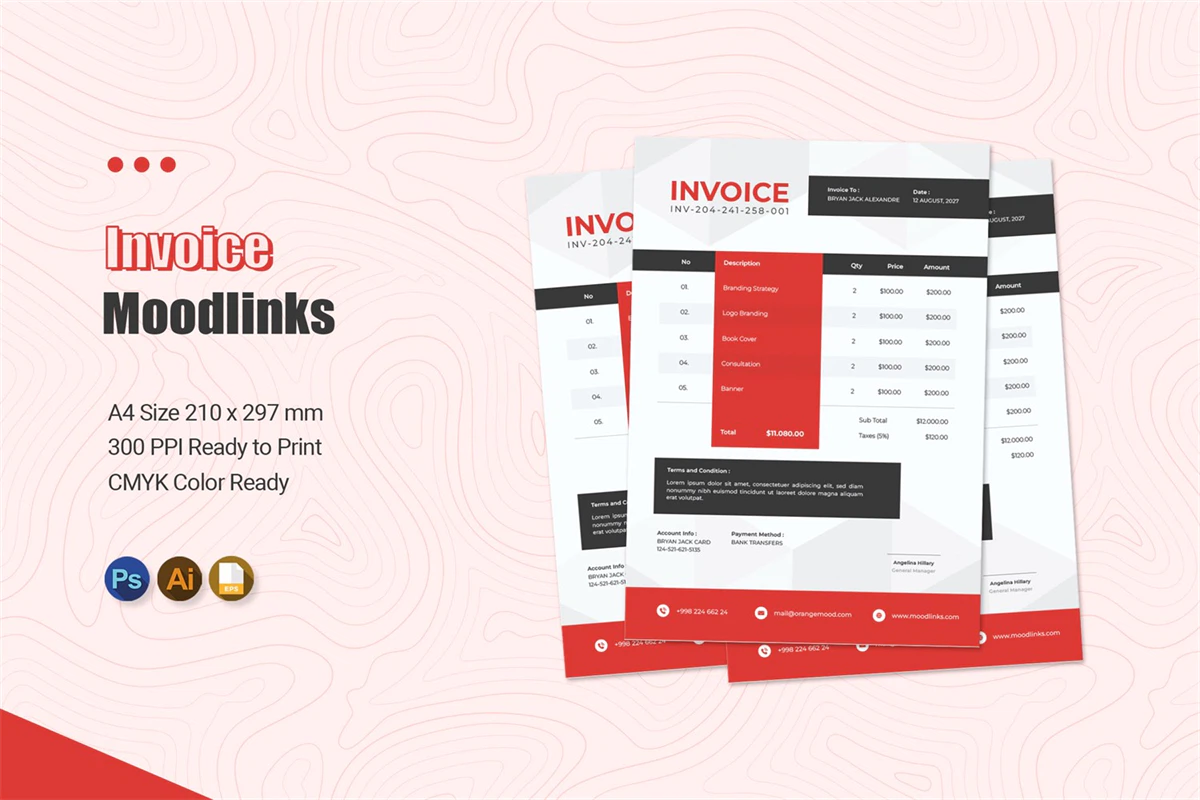 Use our invoices to make your bookkeeping easier and to impress your clients with an invoice display that has a modern, elegant design and strong typography. This invoice template is easy to use and customizable, making it perfect for any medium.