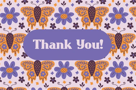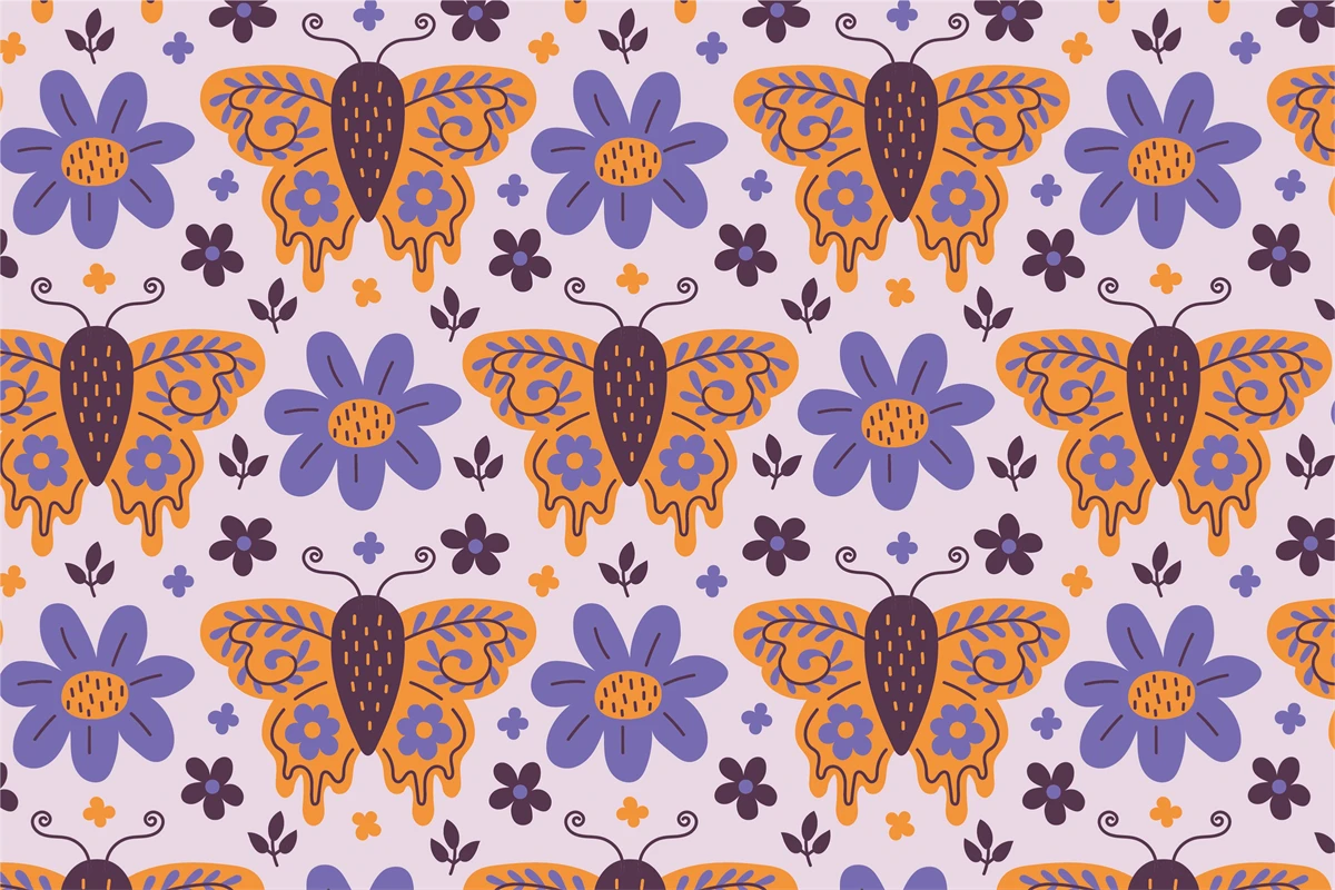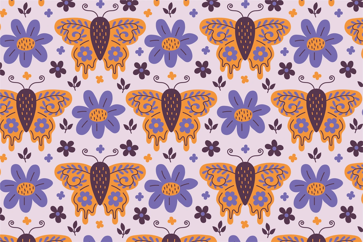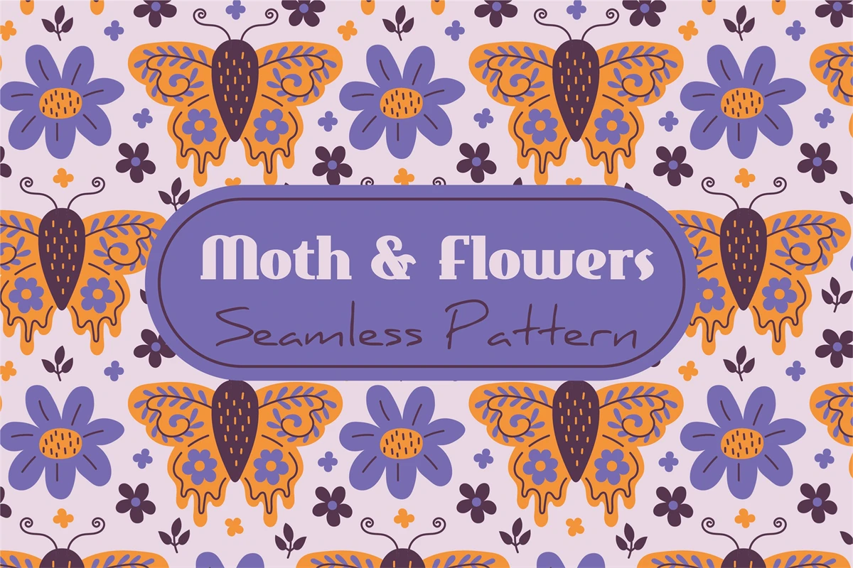 Modern bright seamless pattern with moth and chamomile flower. Folk hand-drawn endless background with butterfly and plants. Repeat vector illustration with natural elements in doodle style. Violet and orange vibrant colored floral digital paper is perfect for fabric, textile, greeting card, wallpaper, decoration, decoupage, scrapbooking, junkbooking. Retro and vintage aesthetics.