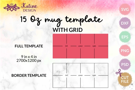 15 Oz Mug: grid, full and border templates in size (9 in x 4 in):