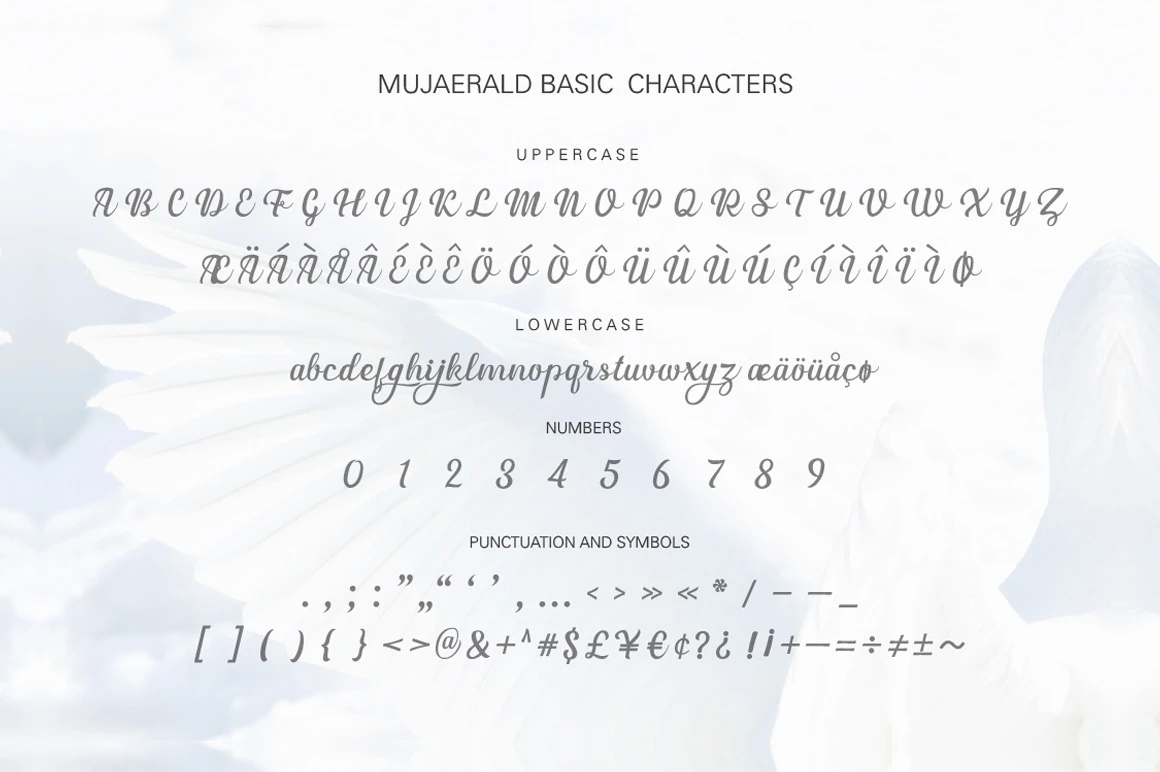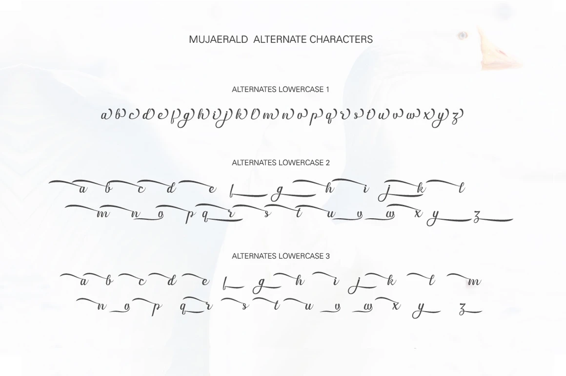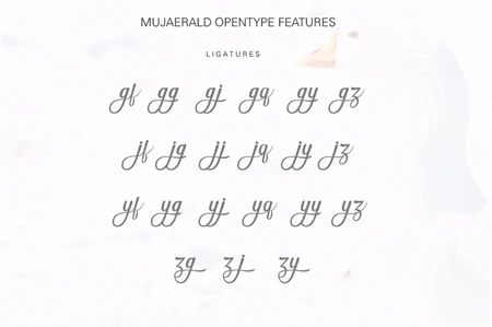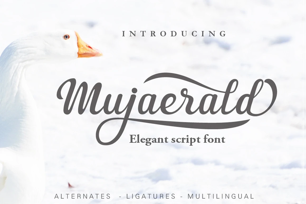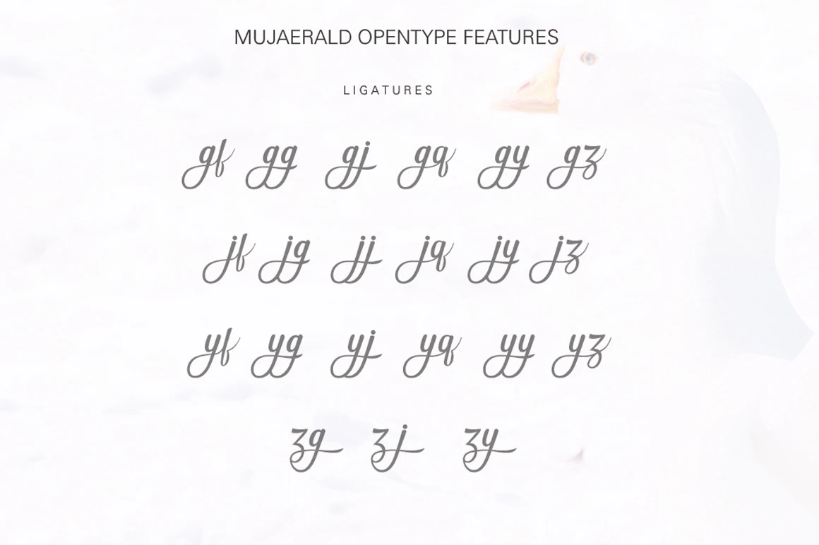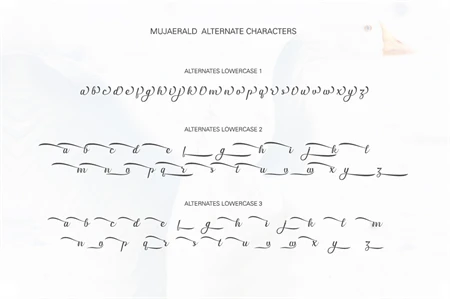 Mujaerald is a nice script font with clear, simple and elegant look. The available alternates and ligatures offer a number of different characters that give your typographic a unique look.
