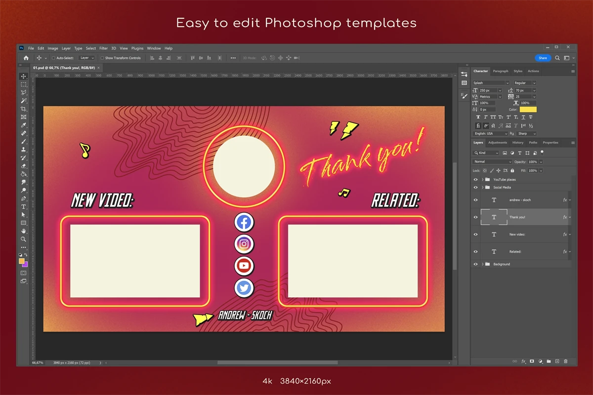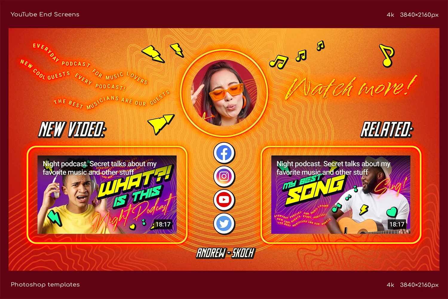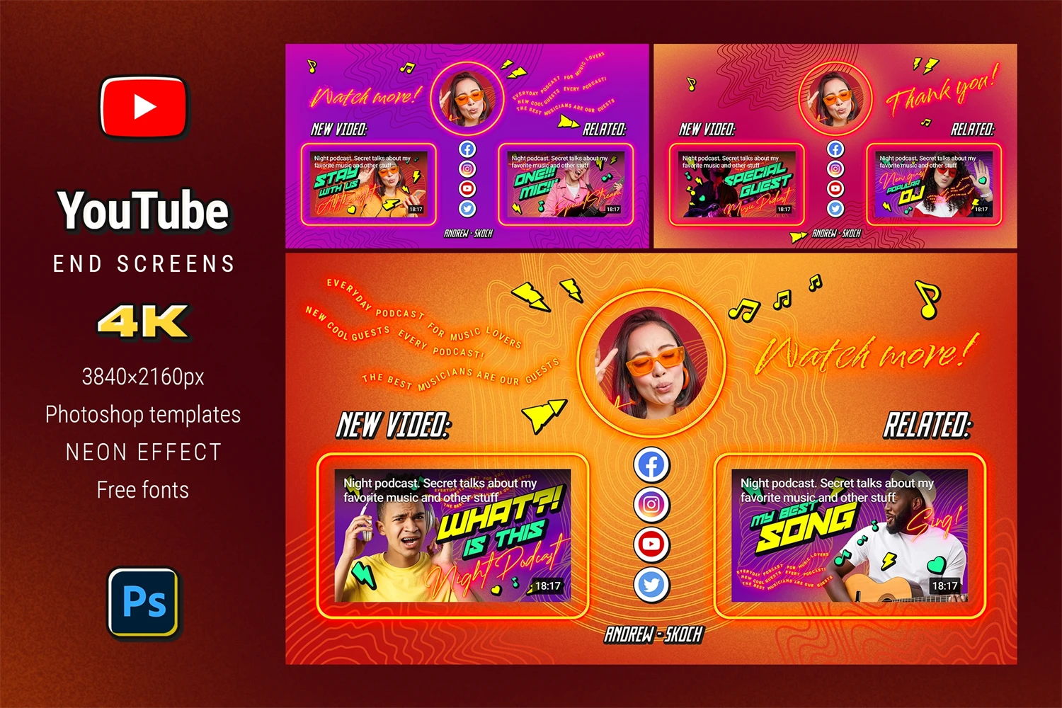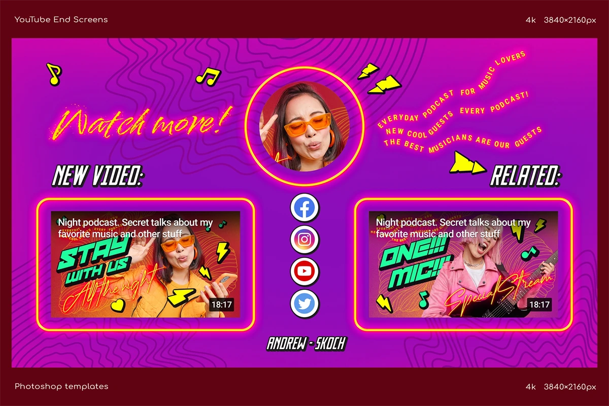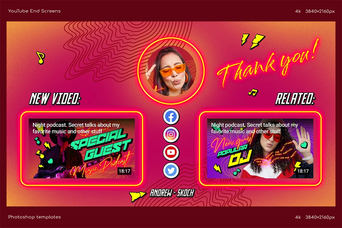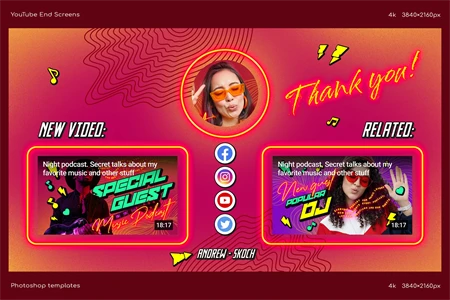 Create cool end screens for your YouTube videos within couple minutes! It's so easy! Great for video bloggers, video makers, video creators, YouTube creators, podcasters, talk shows, YouTube podcasts. Special places for new video, related video, playlist and YouTube profile avatar.