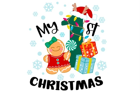 My First Christmas. Baby First Christmas T-Shirt Design for Girl . Gingerbread Man with Santa Claus hat with gifts