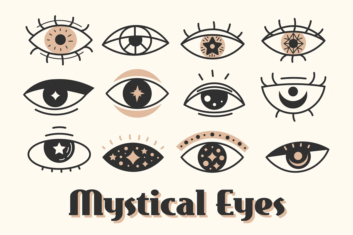 Magical esoteric eyes with crescent, star and eyelashes. Doodle styled mystical illustration with black and golden colors for occult, mystery, sacred, amulet, spiritual, astrology, vision, sight, magic, tattoo, providence, protection, ethnic design. Luck symbol. Evil eye.