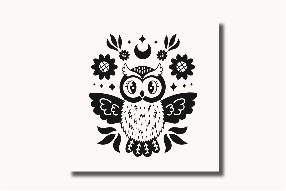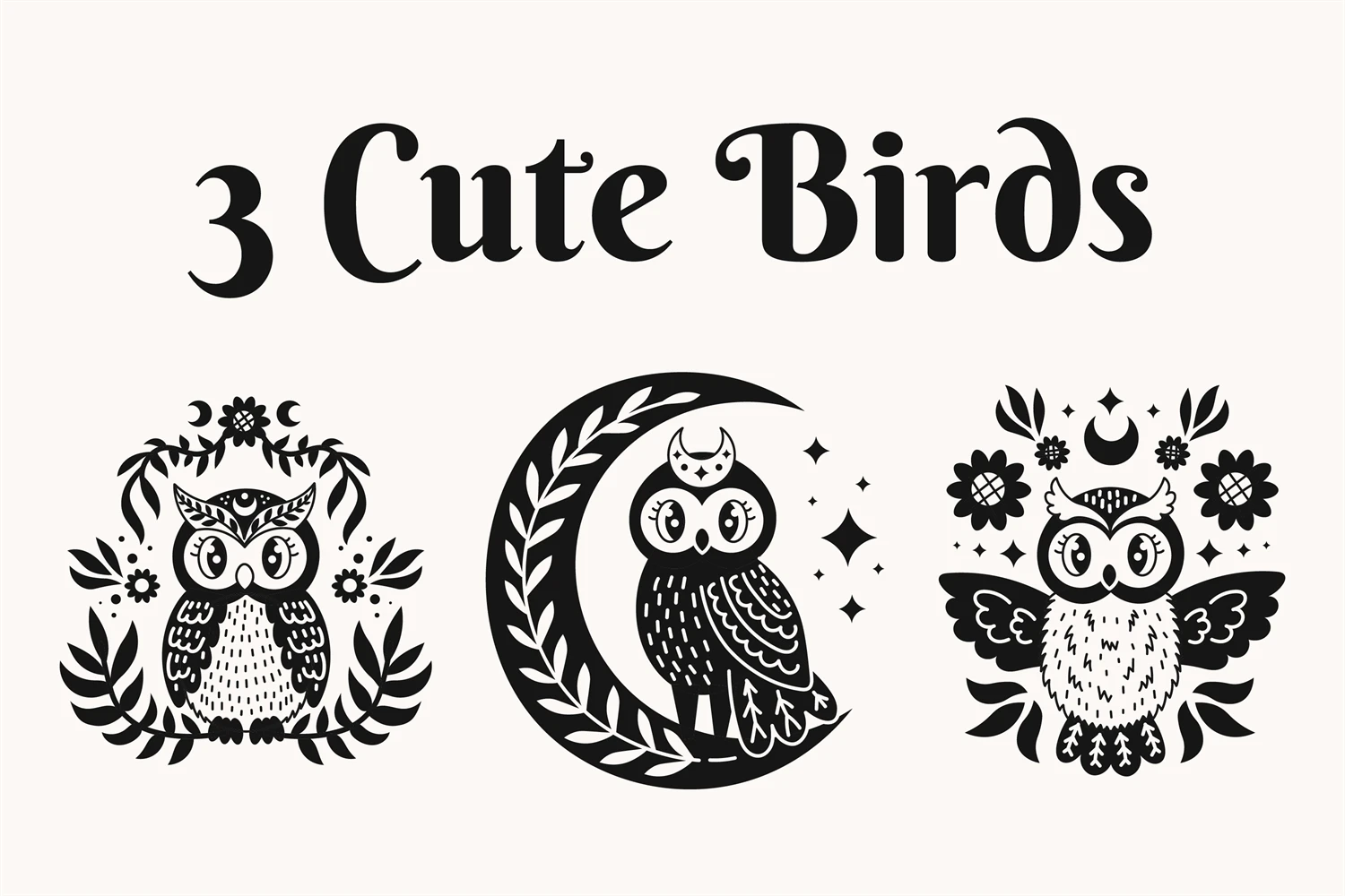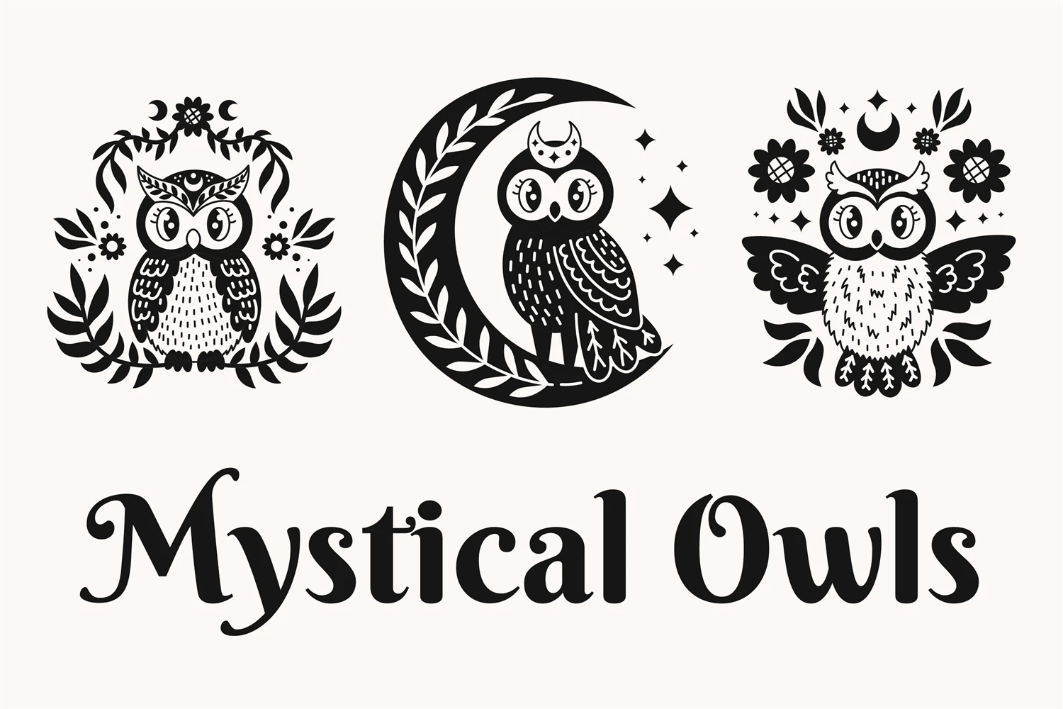 Cute mystical owls in cartoon doodle style. Magical fantasy birds with plants, branches, twigs, floral arrangement, flowers, stars and crescent. Celestial forest animal clipart. Kawaii spiritual characters in anime style. Mysterious vector illustration with black color. Perfect for greeting card, wall apt, tattoo, t-shirt design, stickers, esoteric, occult topics, etc.