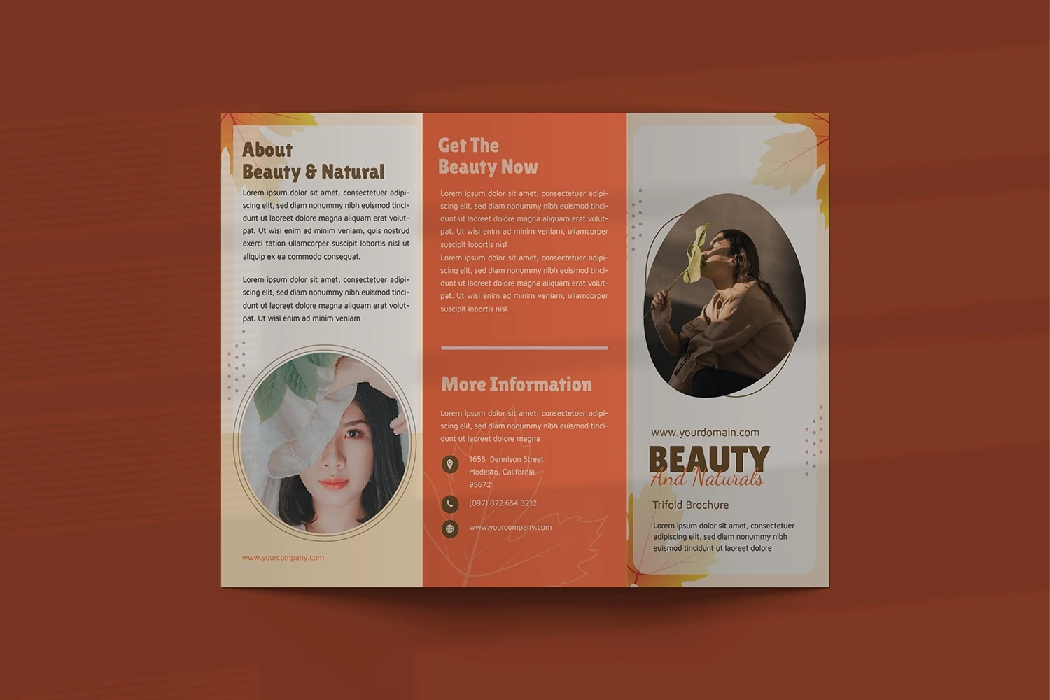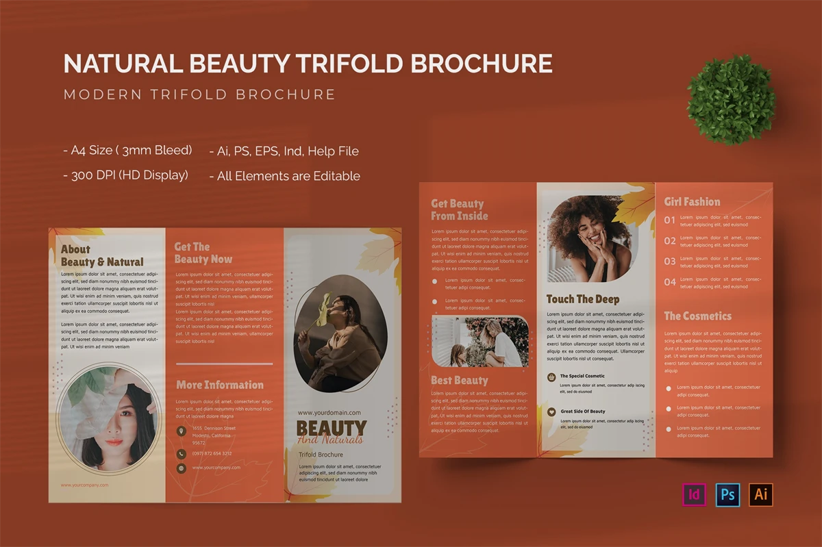 Natural Beauty - Trifold Brochure We present this Trifold Brochure for you, simple, very elegant and professional and this Trifold Brochure is suitable for all types of your business,company or corporate, made with Adobe InDesign (INDD), Adobe Photoshop (PSD) and Adobe Illustrator (AI), very easy to customize, Hope you Like it dont forget to rate, Thanks You.