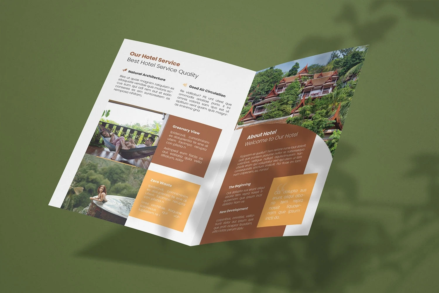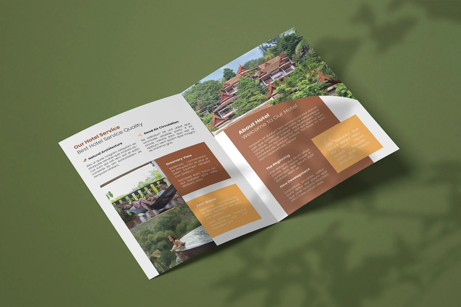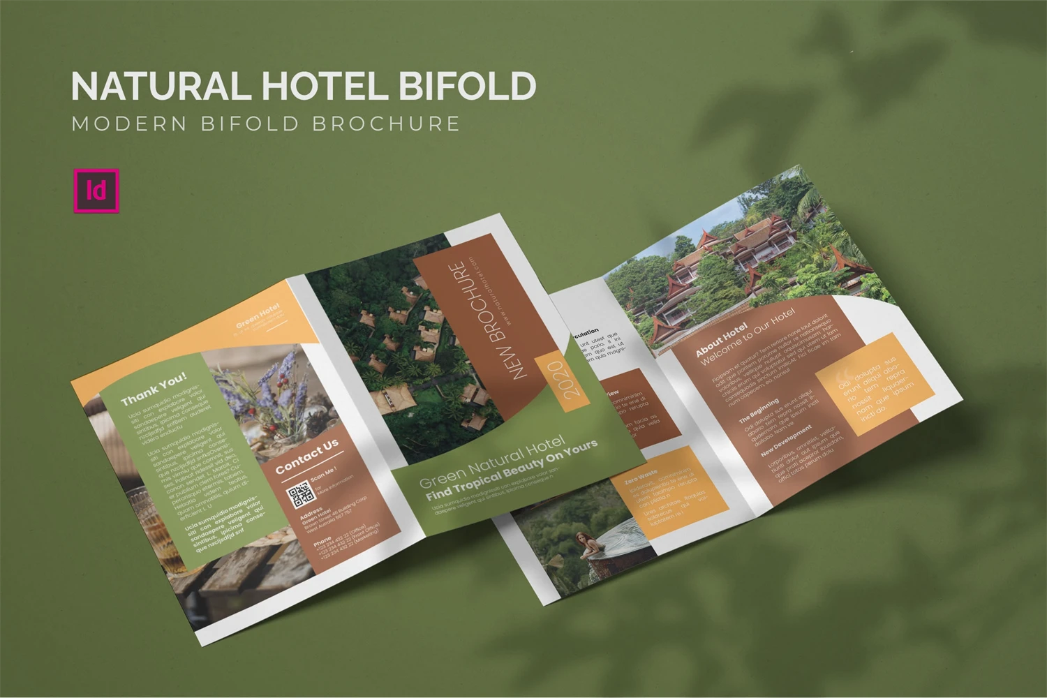 Natural Hotel - Bifold Brochure We present this Bifold Brochure for you, simple and very elegant, and this Bifold Brochure is suitable for all types of your business, made with adobe inDesign, very easy to customize, Hope you Like it, dont forget to rate, Thanks.