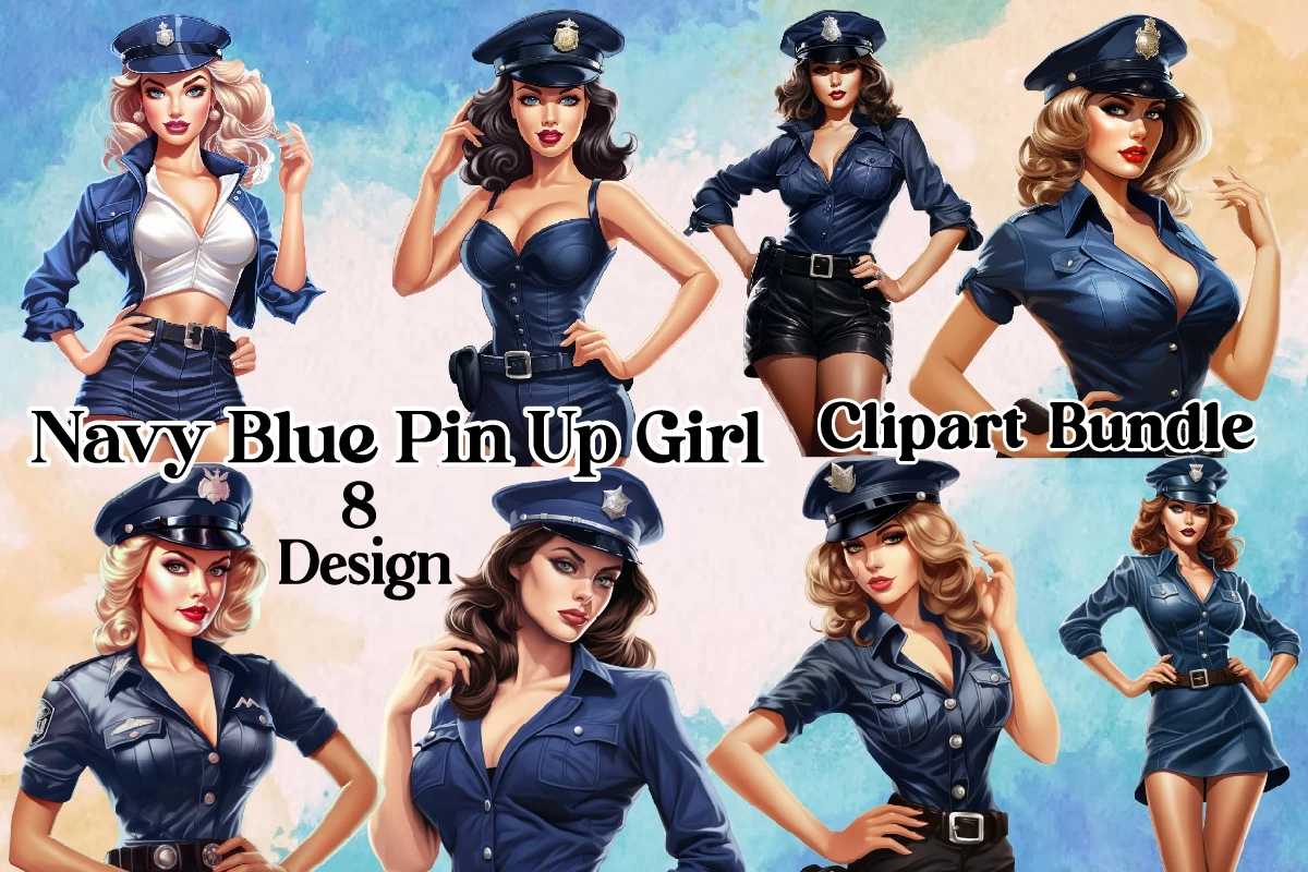 Watercolor Navy Blue Pin Up Girl Clipart PNG Bundle