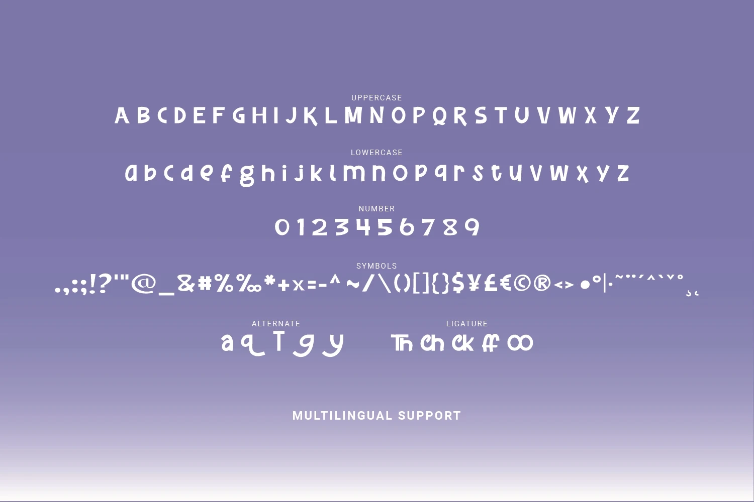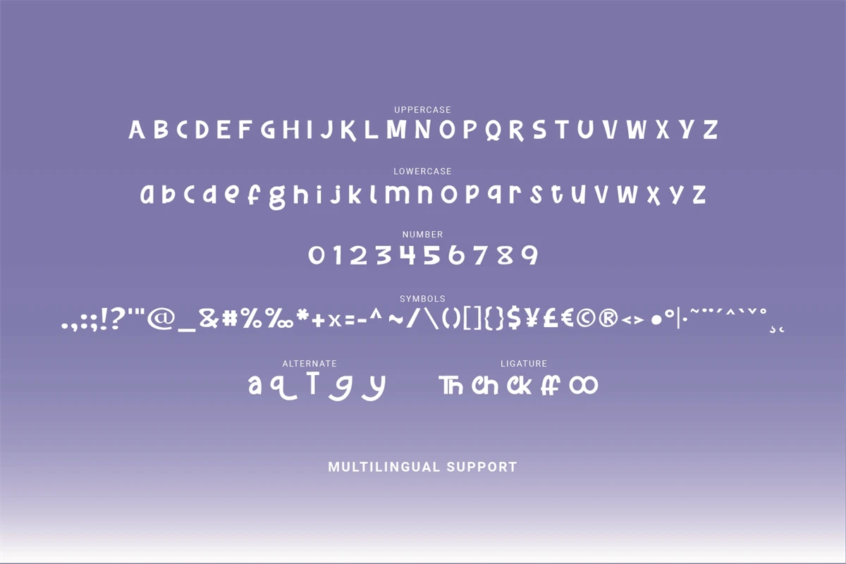 The alternative characters were divided into several Open Type features such as Stylistic Sets, Stylistic Alternates, Contextual Alternate, SWASH, and Ligature. The Open Type features can be accessed by using Open Type savvy programs such as Adobe Illustrator, Adobe InDesign, Adobe Photoshop Corel Draw X version, And Microsoft Word. And this Font has given PUA unicode (specially coded fonts) so that all the alternate characters can easily be accessed in full