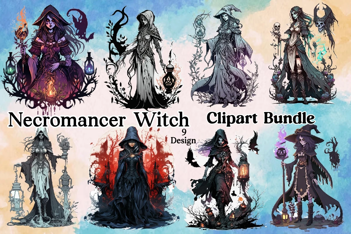 Watercolor Necromancer Witch Clipart PNG Bundle