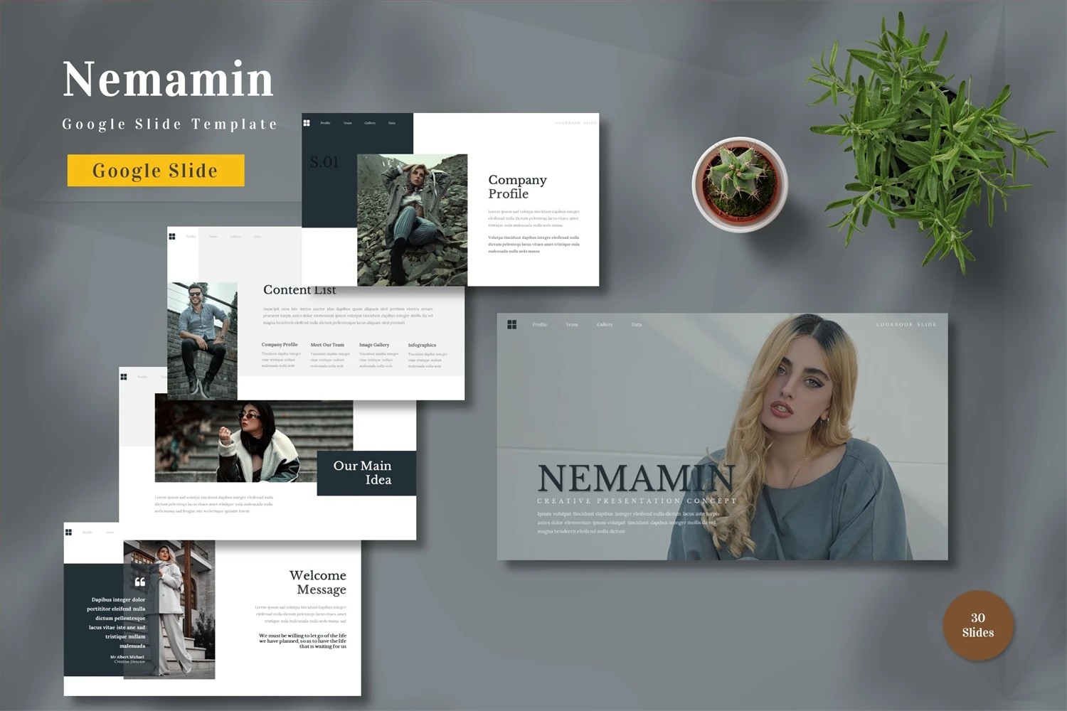 Get it now! **Nemamin - Google Slide Template** for All Business and Personal Needs All elements on this template are editable; input your content, replace your image with a placeholder, change the color, and all presentations include an animated slide to present your slides.