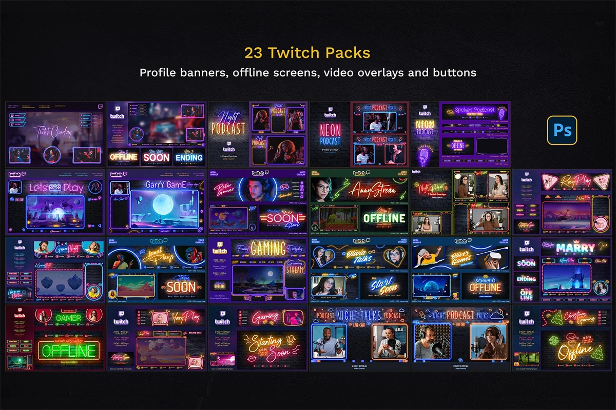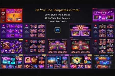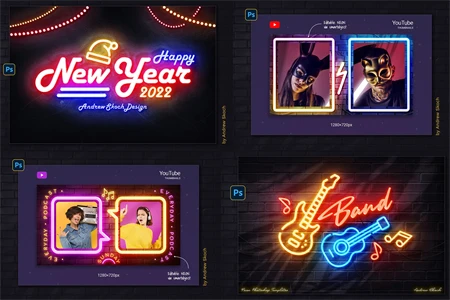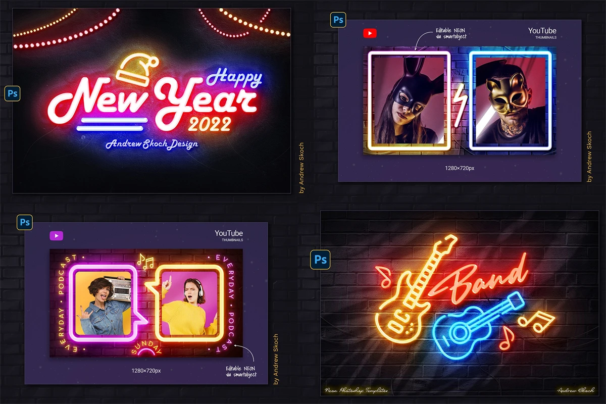Get cool content with these templates bundle. You can make Instagram posts, Facebook posts, YouTube covers and end screens, Twitch profile banners, video overlays for streamers, website banners, presentation slides, magazine pages, ad banners, neon titles. Also you'll get shining neon brushes to create unique graphics. Good for holiday content!