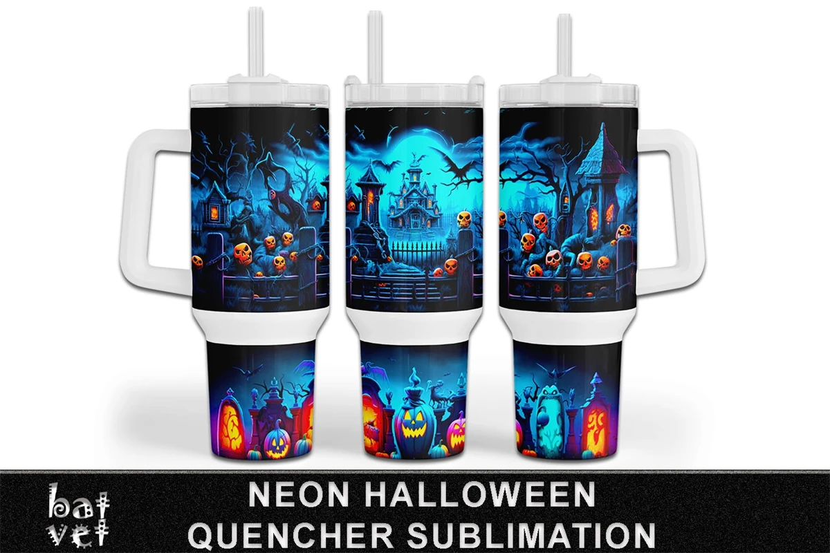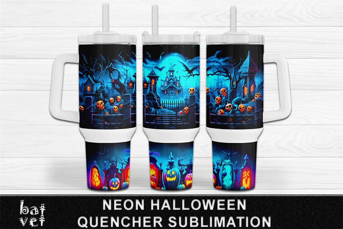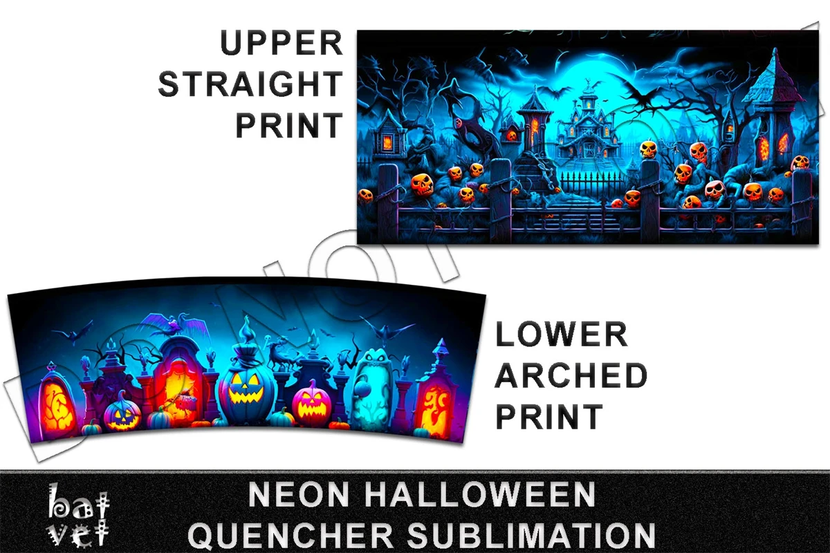 Halloween Tumbler 40 Oz Quencher Neon Halloween, Haunted Mansion, Skull, Carved Pumpkin, Bats, Creepy Cute Sublimation Wrap. Two Part Sublimation Upper Straight and Lower Arched Print.
