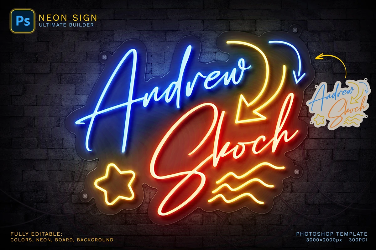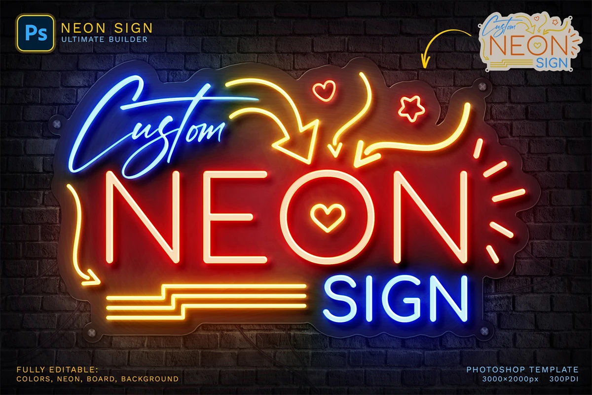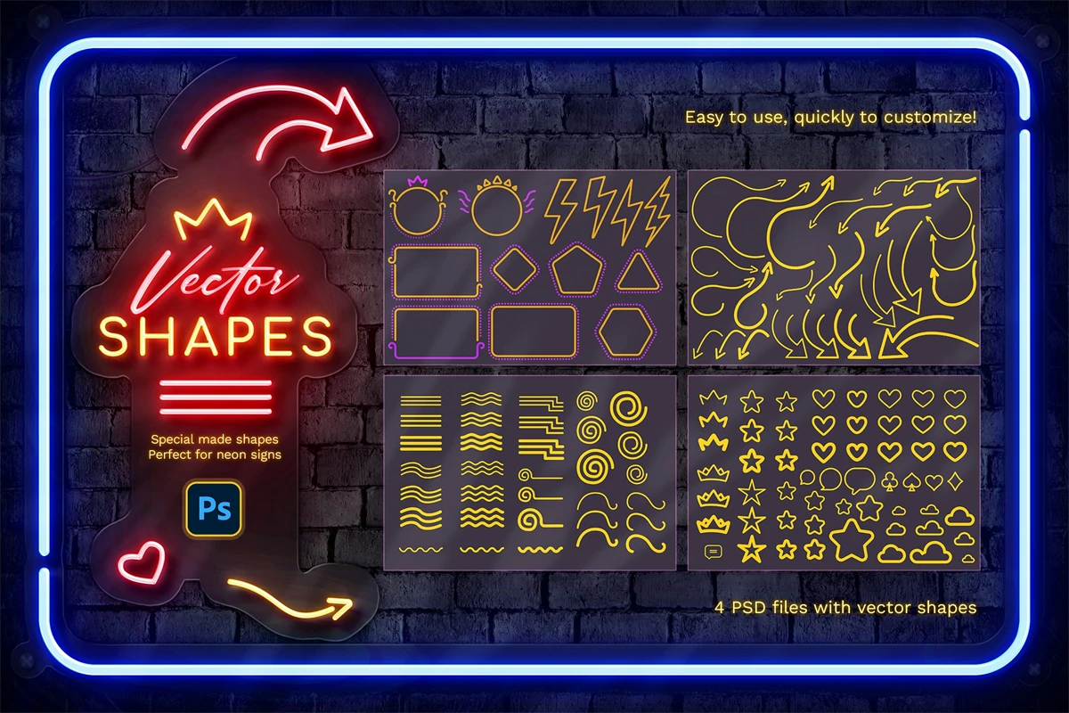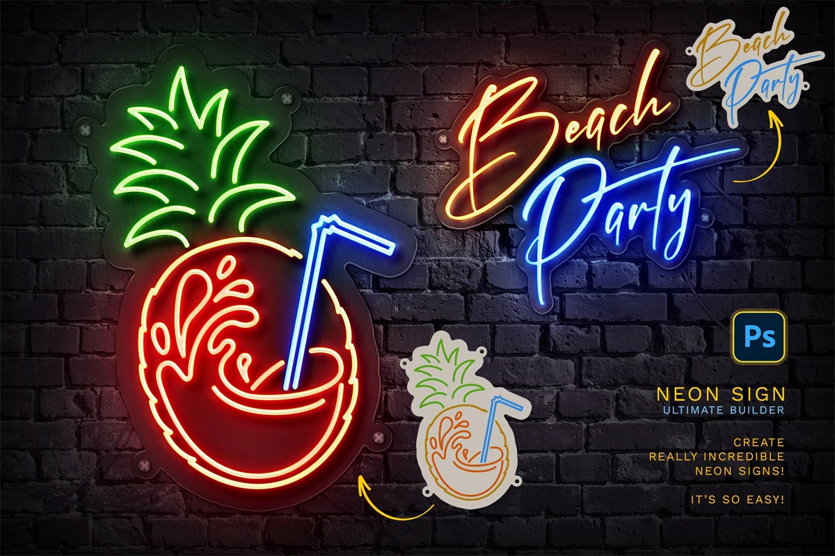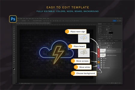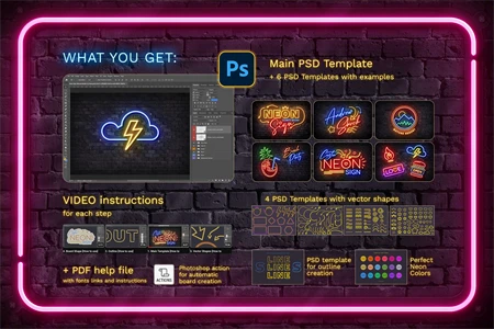 This kit contains all you need for Neon Sign creation! Special neon colors, PSD template for neon outline creation, vector shapes! Creating a board shape is easy, I've prepared special Photoshop action for automatic board creation.