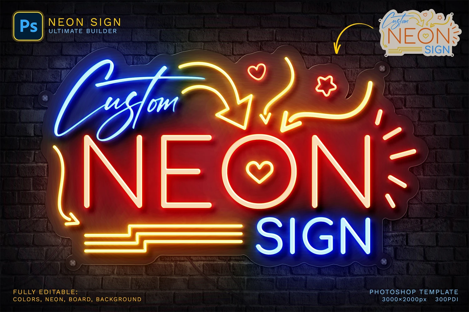 You'll get highly detailed neon sign with metal board and wires on brick wall. There are so many options to customize! You'll use these templates a lot of times for different needs.